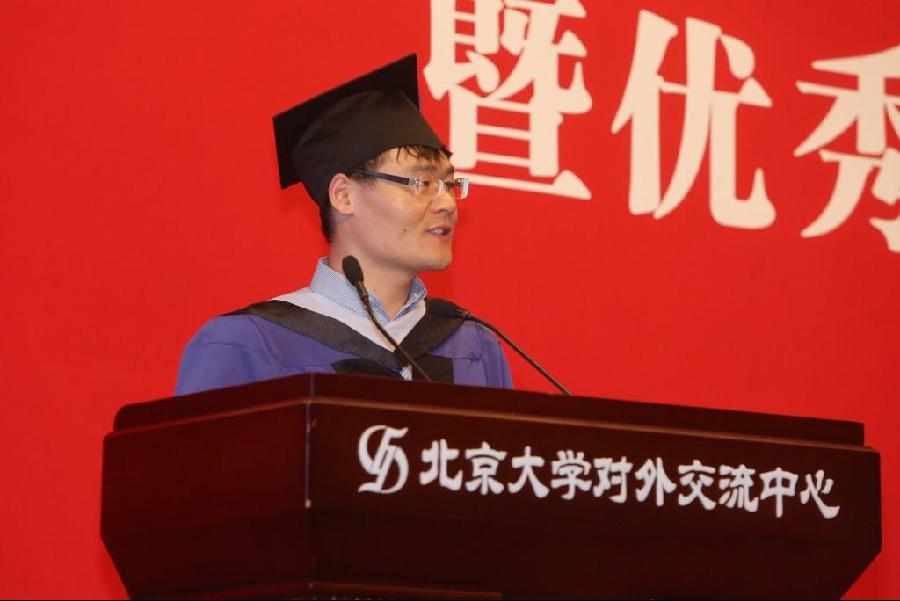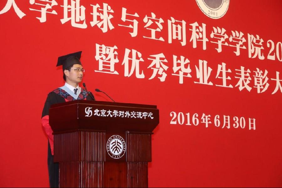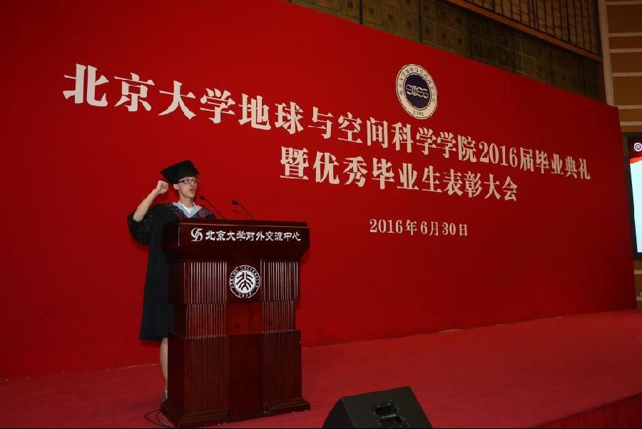 在毕业典礼的尾声,由2012级地质学专业本科生赵浩男领誓,全体毕业生起立,在各位老师和毕业生家长见证下庄严宣誓,他们立志承载北大的光荣与梦想,践行社会责任与担当,为实现中华民族伟大复兴,挥洒青春,奋斗终生!