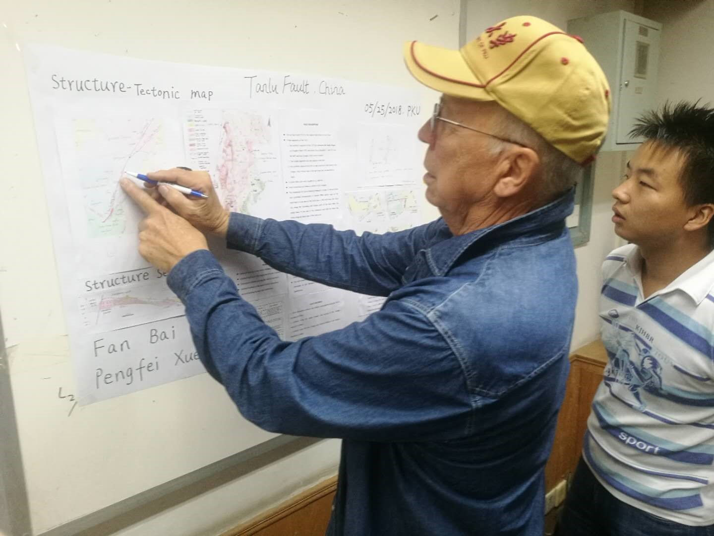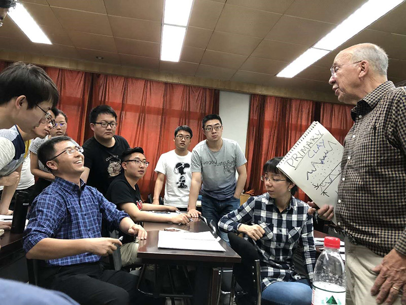 图7. George H.Davis教授给研究生同学们讲授构造物理模拟实验(模拟里德尔剪切破裂及地震断层)思路、方法、观测与地质构造思考等科学实验(5月26日)