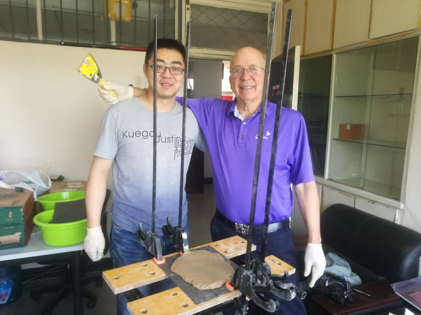 图6. George H.Davis教授与地质系博士生张磊同学正进行地质物理模拟实验设备的安装与调试(5月23日)