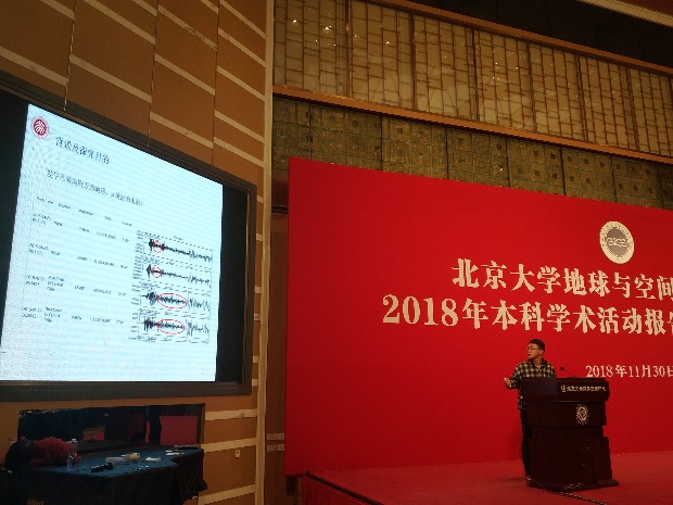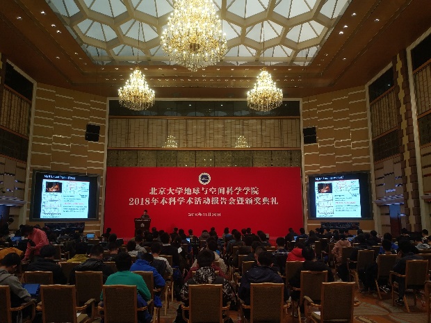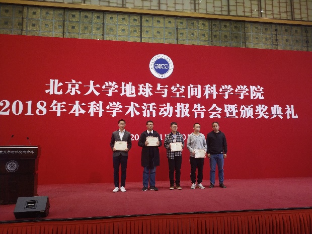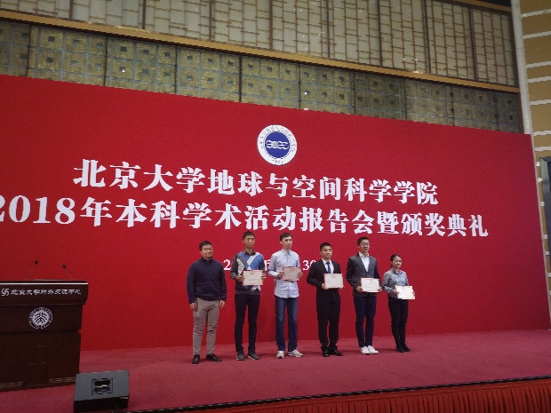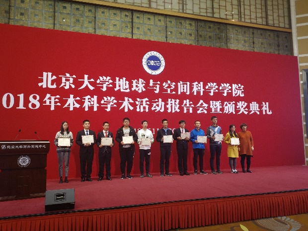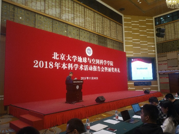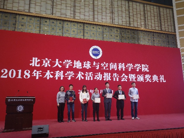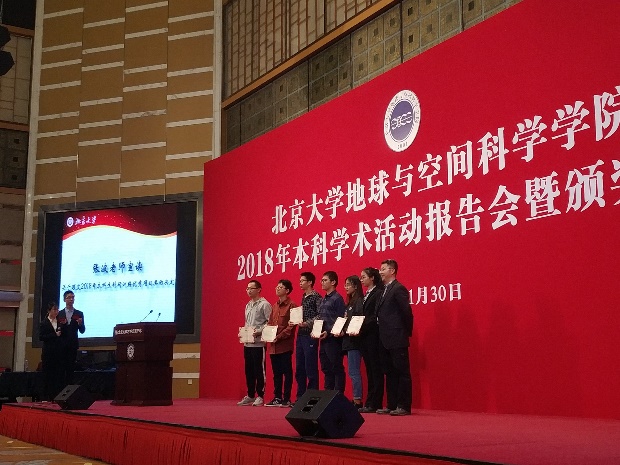 同时,现场还对过去一年中在本科生科研、野外实习等学术活动中取得优异成果的同学们进行了表彰。张波老师宣读了“颁发2018年本科生科研训练优秀项目奖的决定”,并为获奖同学颁奖。张老师表示,自己十分高兴能看到有很多同学在本科阶段就能参与到科研项目中。他认为这些同学通过本科生科研拓宽了自己的知识范围,培养了自己的动手、创新和科研能力,为自己未来的科研道路提供了良好的开端。田原老师则宣读了“颁发2018年本科生优秀实习报告奖的决定”,并与薛进庄老师为获奖同学颁奖。田老师提到野外实习是学院重要而且最有特色的教学项目,也同时说明了该奖项的设立旨在促进同学们夯实基础、结合理论与实践、建立正确的地学思维并树立正确的人生观和苦乐观。