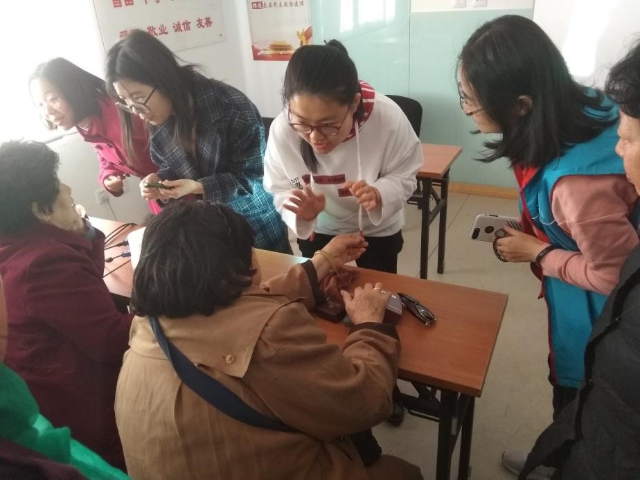 人工钻石和天然钻石如何区别?如何辨别翡翠真假?老人们饶有兴致提出各种问题,老人们还带来了珠宝玉石请同学们鉴定。同学们耐心细致的为老人们一一解答问题,教他们如何初步判断宝石的真伪。