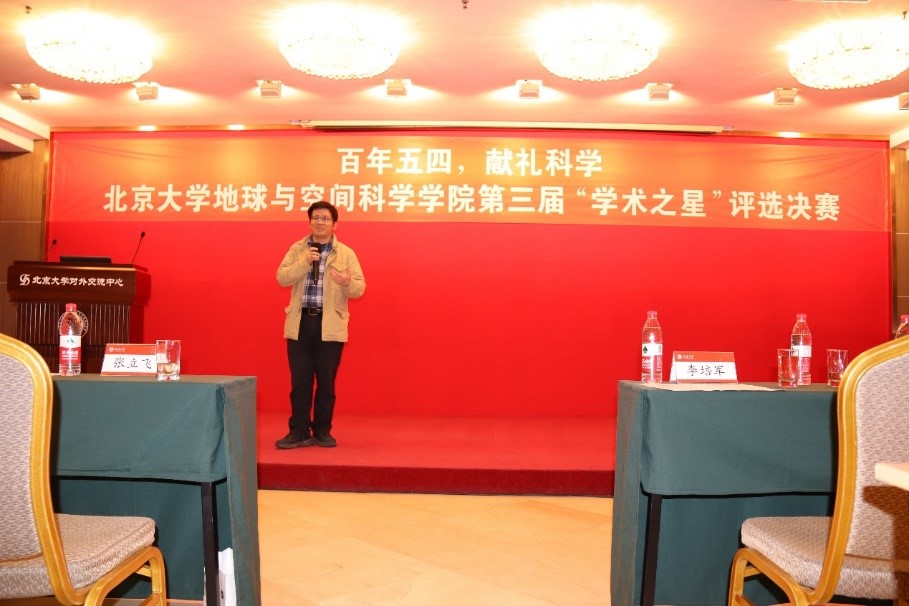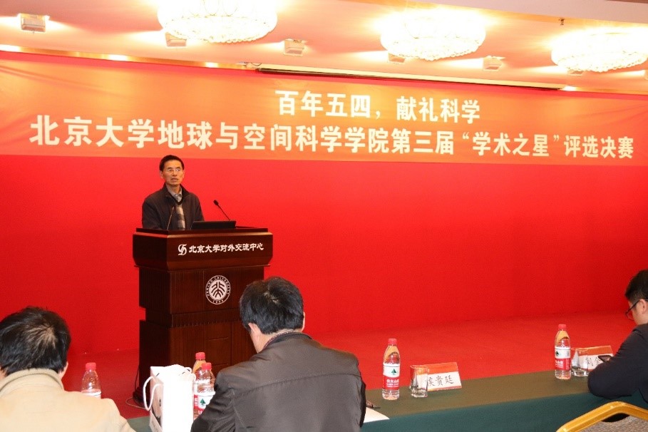 颁奖仪式后,何建森老师和张波老师对本次活动做了总结。何建森老师首先感谢了学院老师、参赛选手、地空研会等对本次学术之星活动的辛勤付出,赞扬了选手们在活动过程中体现出的学术素养,同时鼓励大家要有“山高人为峰”的进取精神,希望大家勇攀科研高峰,为真理而奋斗。张波老师则结合自己15年前参加北大“挑战杯”的经历,以及15年后以评委身份参加学院唯一以学生为主体的学术活动的经历,对同学们进行鼓励。张波老师感慨到,跟大家一起讨论科学问题不禁使自己又找到了学生时代的感觉,希望大家以科研为支撑,每年都能相聚于此交流成果、分享经验,并祝愿大家能真正静下心来,回归到科研本身,脚踏实地,奋斗青春。