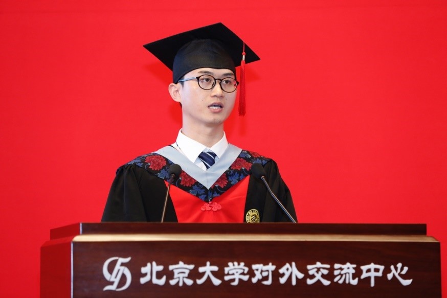 2015级本科生张思源同学作为本科毕业生代表发言。张思源在发言中分享了自己求学经历中的所见、所闻和所学。从入学时的青涩模样成长为一个富有荣誉感和使命感的少年,北大是每个北大学子的第二个家,这个既温馨有严肃,既能获得知识,又能参与不同的社团,体会大学生活百态,他列举了自己的导师盖老师的事例,老师们亲切和蔼的待人品行和严谨的学术作风世人受益良多;在学习的同时,有可以参与各种各样的课外活动,丰富了我们的生活。最后,他向母校与学院表达了自己诚挚的感谢与深切的热爱之情。