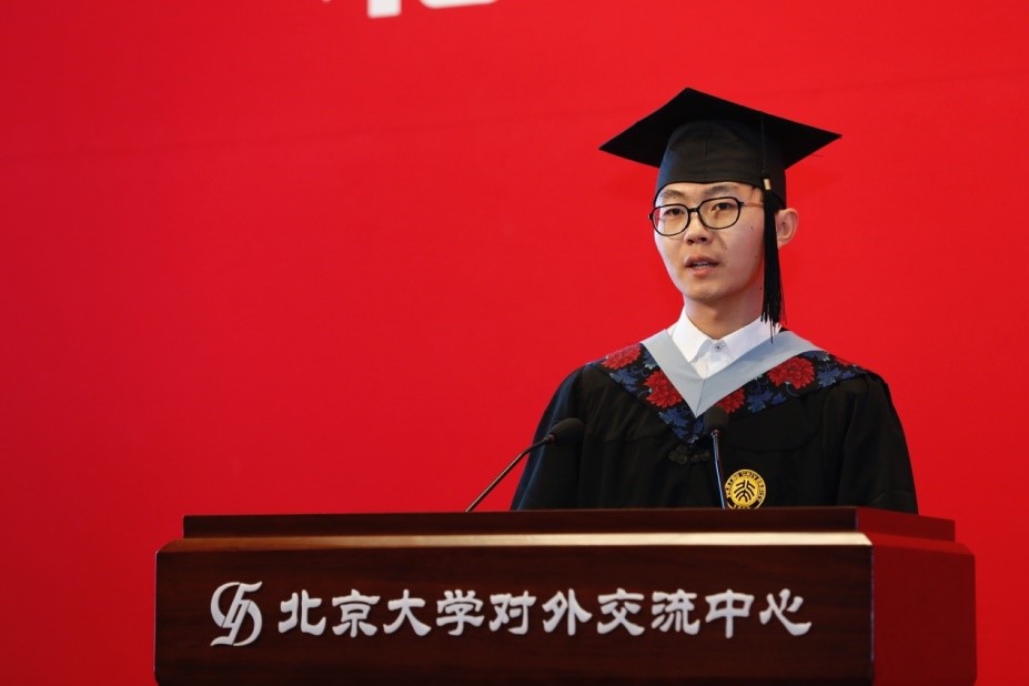 2014级博士生蒋启财同学作为研究生毕业生代表发言。他回首五年以来在燕园求学的经历,感谢这五年与之朝夕相处的老师、同学和朋友。蒋启财以一名国家基层选调生的角度为我们讲述了他对人生的感悟与思考。他引用了习近平总书记在纪念五四运动100周年的讲话,表示要传承腐漫画