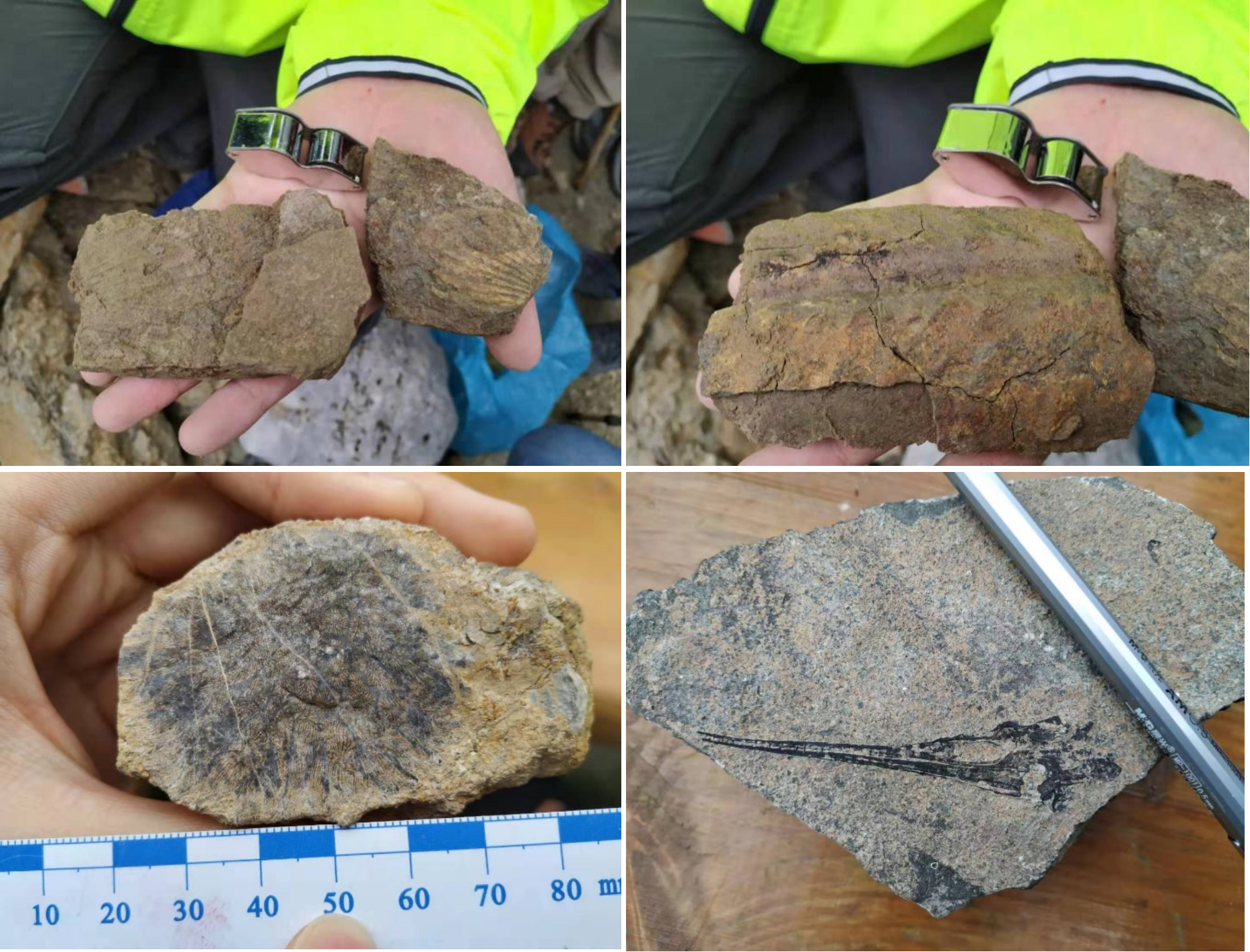 在纵览了整个台地-盆地的全貌后,AndreaTintori教授带领同学们绕行下山,在海拔1826米处的中三叠WengenFormation的砂岩中,同学们进行了化石找寻和鉴别工作。虽然山间雾气缭绕,气温“动人”,但是同学们却热情高涨,发现了珊瑚、双壳类动物、菊石等诸多化石。下午4点钟,韩宝福和AndreaTintori两位教授先后为实习队同学作了关于阿尔卑斯地区火成岩和鱼类化石的报告。最后,AndreaTintori教授向同学们展示了在实习区发现的一系列化石。