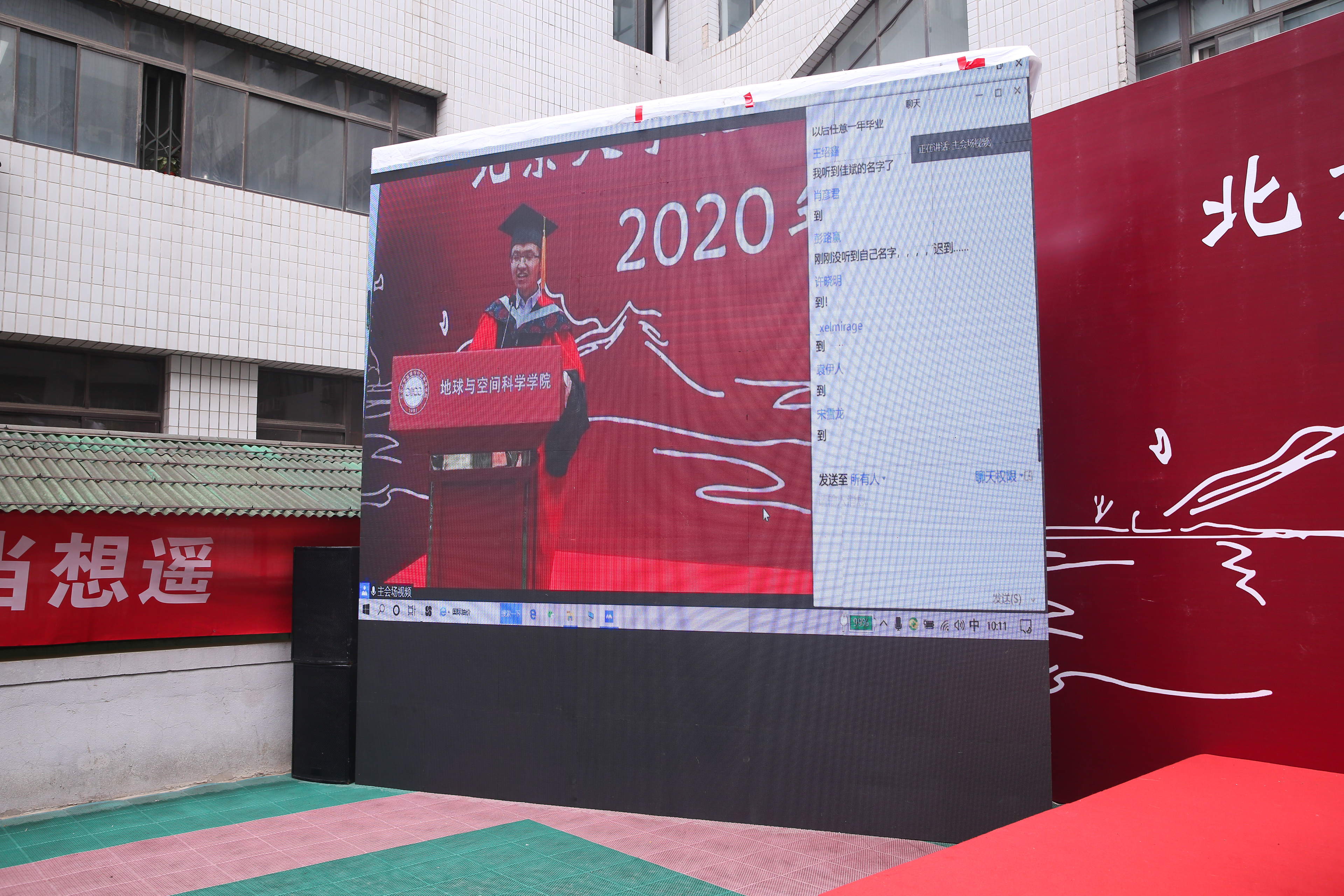 在典礼现场,学院为每一位未能返校的同学都摆放了座椅和名签,也专门设置了一面LED屏幕展示师生线上参与的情况,现场毕业生与线上师生通过现场大屏幕展示出来的聊天框实时互动,实现了无论身在何方,心都连在一起。