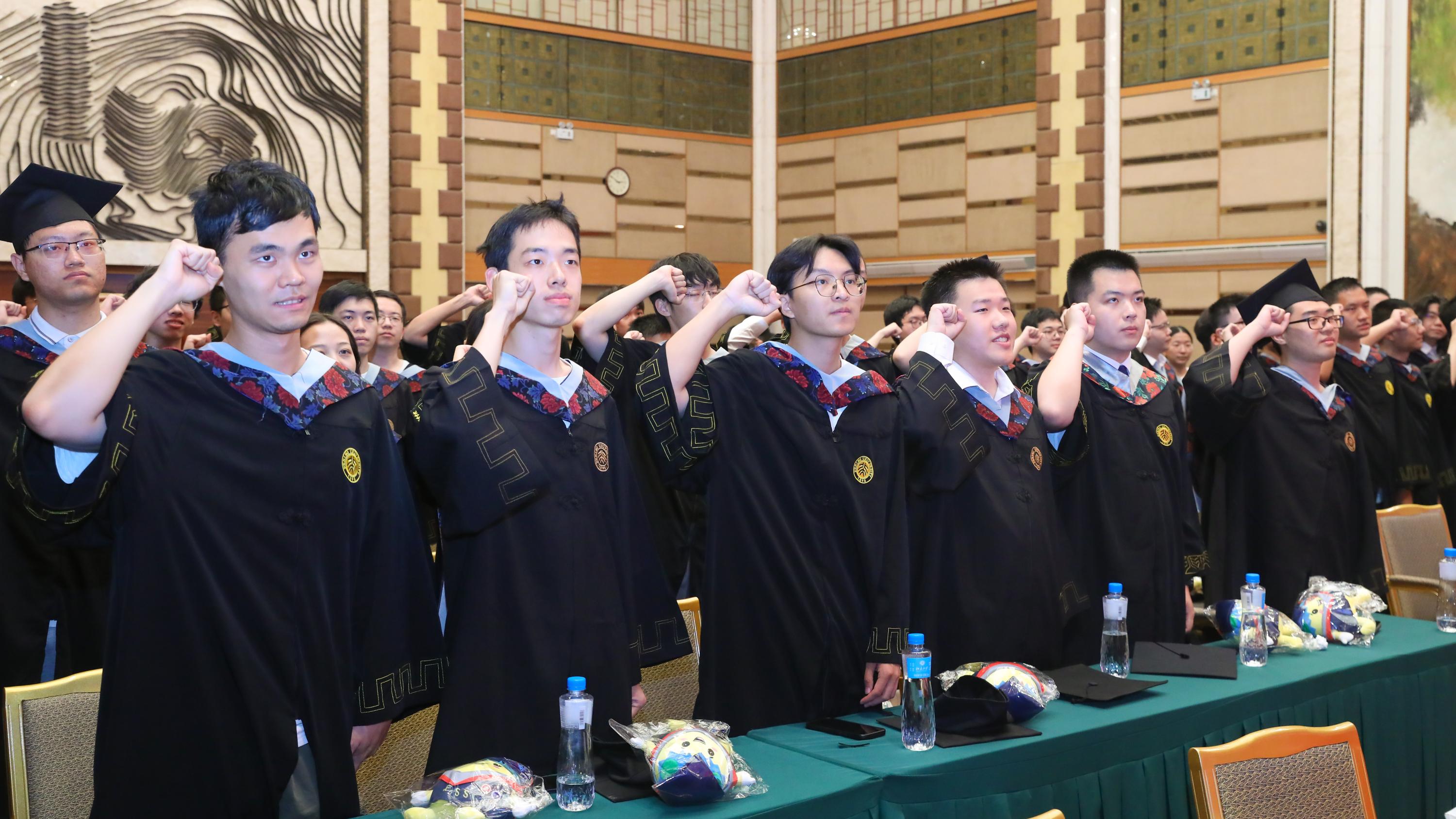 毕业生代表庞帅带领全体毕业生庄严宣誓,毕业生们集体许下“脚踏实地,践行时代责任与使命;仰望星空,承载北大精神与梦想”的誓言。