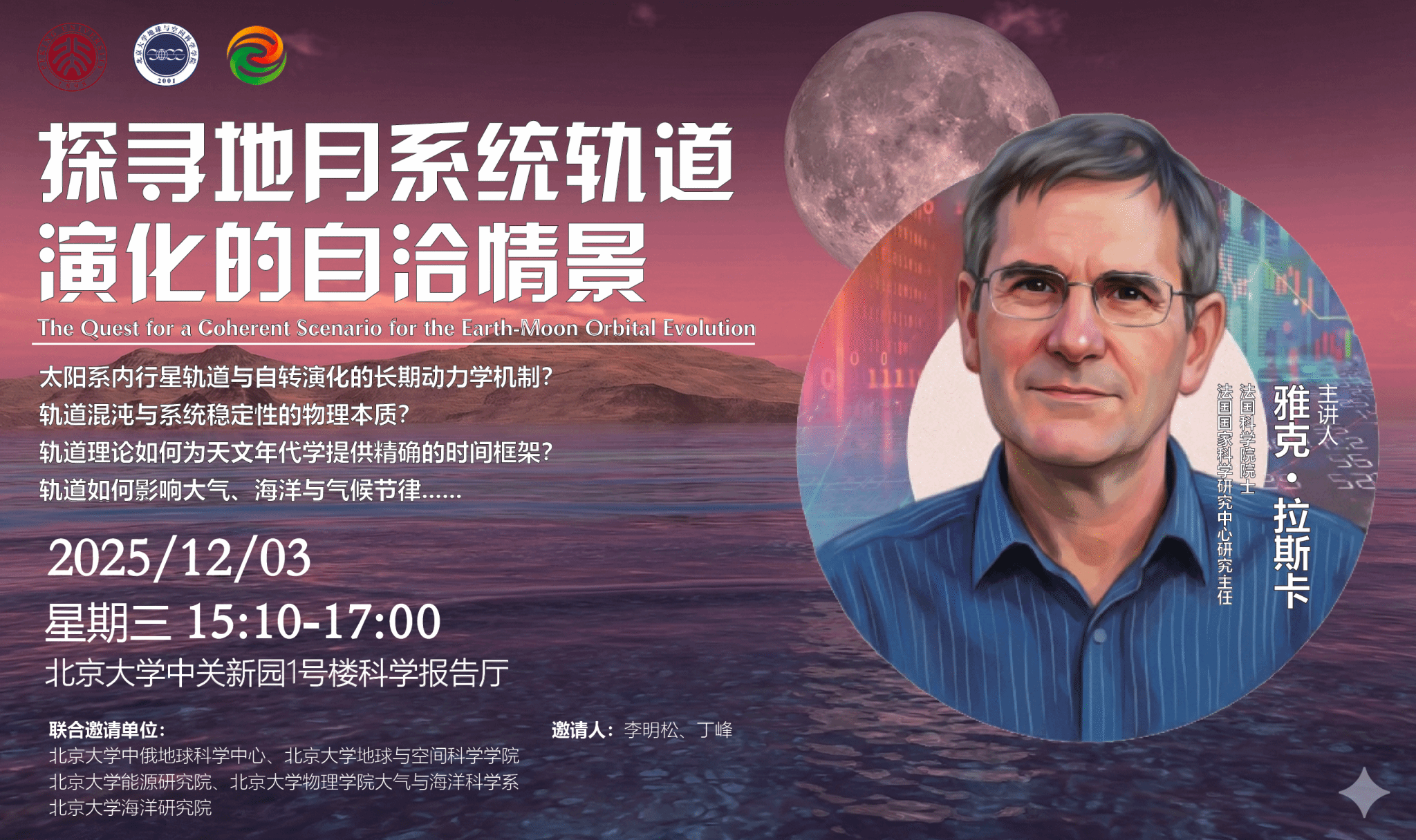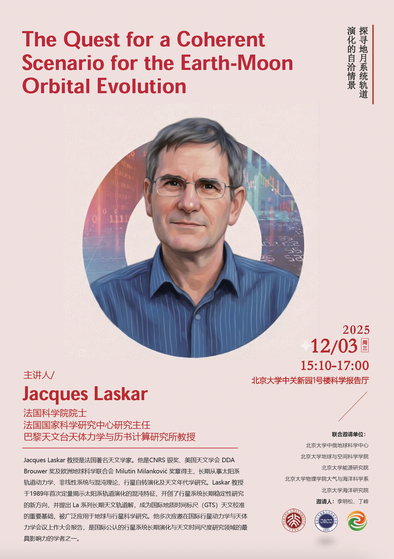 Jacques Laskar 教授是法国著名天文学家。他是CNRS 银奖、美国天文学会 DDA Brouwer 奖及欧洲地球科学联合会 Milutin Milanković 奖章得主,长期从事太阳系轨道动力学、非线性系统与混沌理论、行星自转演化及天文年代学研究。Laskar 教授于1989年首次定量揭示太阳系轨道演化的混沌特征,开创了行星系统长期稳定性研究的新方向,并提出 La 系列长期天文轨道解,成为国际地质时间标尺(GTS)天文校准的重要基础,被广泛应用于地球与行星科学研究。他多次应邀在国际行星动力学与天体力学会议上作大会报告,是国际公认的行星系统长期演化与天文时间尺度研究领域的最具影响力的学者之一。