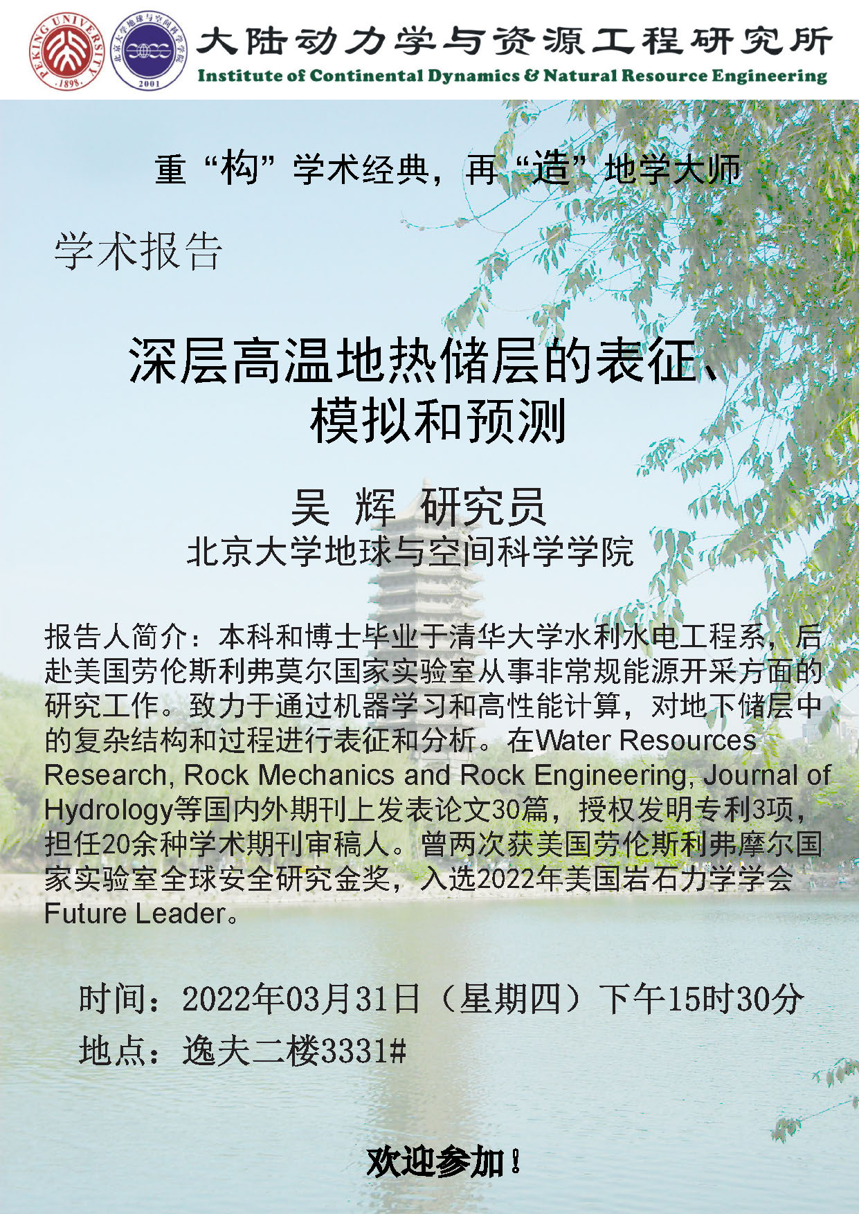 个人简介:吴辉,腐漫画 研究员、助理教授。本科和博士毕业于清华大学水利水电工程系,后赴美国劳伦斯利弗莫尔国家实验室从事非常规能源开采方面的研究工作。致力于通过机器学习和高性能计算,对地下储层中的复杂结构和过程进行表征和分析。在Water Resources Research, RockMechanics and Rock Engineering, Journal of Hydrology等国内外期刊上发表论文30篇,授权发明专利3项,担任20余种学术期刊审稿人。曾两次获美国劳伦斯利弗摩尔国家实验室全球安全研究金奖,入选2022年美国岩石力学学会Future Leader。