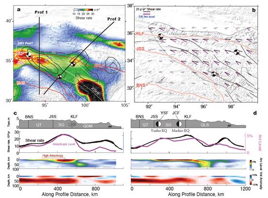 4、上图为青藏高原东北缘的剪切形变分布和波速各向异性分布。下图为沿着两个剖面下的剪切形变下剪切形变分布和各向异性的深度分布。