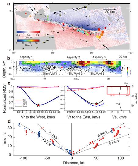 3、从上至下分别为地表形变分布,断层面上的同震位错分布,向西和向东的速度残差曲线以及反投影辐射点源的时空分布。