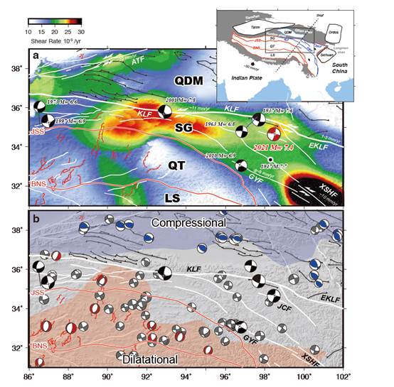 青藏高原被称为“世界屋脊”,其隆升和溢出由印度板块和欧亚板块碰撞产生,其独特的高程形态和形变模式是反应了大陆持续碰撞挤压的作用。具体而言,其地表形变经历了南侧喜马拉雅山附近的挤压,中部羌塘块体的拉伸,松潘甘孜块体的剪切以及北部柴达木盆地和祁连山的挤压几种形变模式的转化(图1)。其中松潘-甘孜块体的剪切形变协调了羌塘块体东西向的扩张和柴达木块体南北向挤压之间的形变差异。该块体也是我国最活跃的一个块体。过去30年间的几次大地震,包括1997玛尼,2001昆仑,2008汶川以及2010玉树等地震,都发生在块体边界断层上,如昆仑断层,龙门山断裂带以及甘孜-玉树断层。因此在“活动块体模型”中,该区域的形变主要集中块体边界。然而,当代大地测量观测显示松潘甘孜块体的形变主要集中于块体内部(图2)。 这些观测的差别让高原形变研究产生两个疑问:1. 块体内部的形变以何种形式释放?2当代形变观测是否反映了高原长期的形变模式? 2021年发生于松潘甘孜块体内部的玛多地震提供了回答该问题的一个契机。