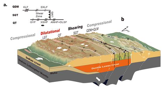 同时该工作也分析了松潘甘孜块体区域的剪切应变率和地震波速各向异性的分布。发现剪切应变集中区域和各向异性分布具有高度的空间相关性,同时剪切方向和各向异性方向也有较好的一致性。由于剪切应变只反应了当代地表形变模式,而各向异性反应了在地质年代下(百万年)尺度的应变模式。两种观测的一致性反应了现今观测到的地表分布式形变在整个松潘甘孜块体的演化历史中也是一种主要的形变模式。地震波各向异性的深度反应了这一特征集中于地表30km深度以内(图4)。 同时结合松潘甘孜块体内部广泛发育的褶皱结构,该研究提出了用HTI(水平横观各向同性)介质解释应变以及波速模型。并指出松潘甘孜块体在三叠纪和第三纪经历的两次缩短事件将古特提斯洋遗留的增生楔沉积层挤压褶皱,形成了纵向分布的分层结构。这些分层结构在水平剪切力的作用下导致了各向异性和剪切形变的一致性。该分析同时指出块体两侧的剪切应力加载性形成该形变模式的主要驱动力,这与青藏高原流体模型下来自下地壳流的驱动力不同。