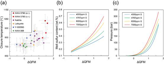 1 (a) 本研究所得的NWA 5790 nakhlite钛磁铁矿-钛铁矿闭合温度和氧逸度(红点),与前人所做的nakhlite中钛磁铁矿-钛铁矿的闭合温度和氧逸度进行比较。(b) 总硫含量与氧逸度的去气模拟。(c) 压力与氧逸度的去气模拟。