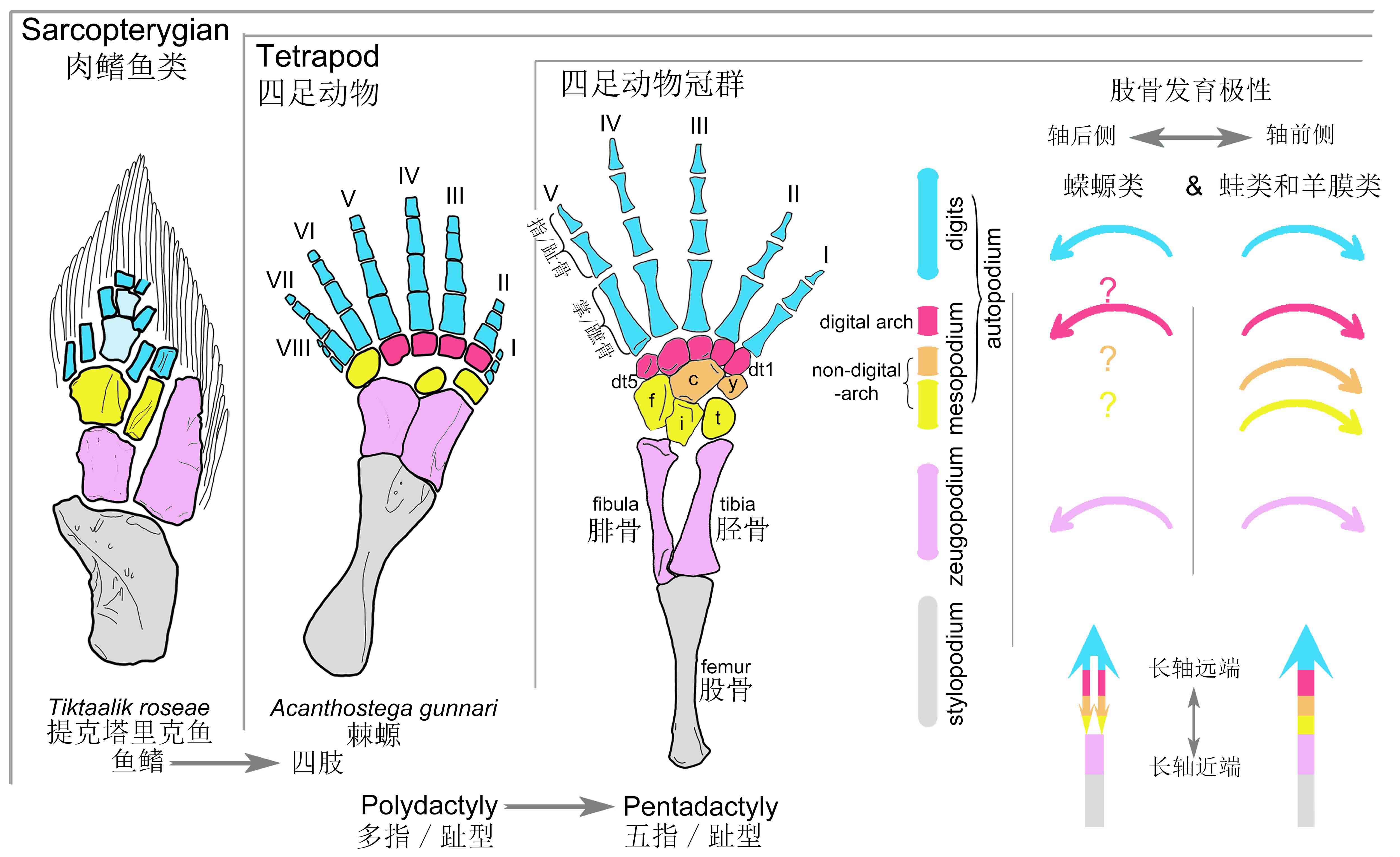 此外,胚胎发育研究为了解从鱼鳍到四肢的演化开启了新的篇章。前人研究发现现代四足动物的最原始类群——蝾螈类(一类现代两栖动物,代表物种为中国大鲵,俗称娃娃鱼)肢骨的早期发育过程(间充质细胞聚合[mesenchymal condensation]和软骨成骨[chondrification])存在轴前优先性(preaxial dominance),即长轴前侧(靠近大拇指的一侧)的骨骼先于后侧的骨骼出现。例如,墨西哥钝口螈的脚趾形成顺序为II-I-III-IV-V,胫骨先于腓骨形成。这一发育模式与蛙类和羊膜动物肢骨早期发育过程中所展现的轴后优先性(postaxial dominance)恰好相反,如蛙类或乌龟的脚趾形成顺序为IV-V-III-II-I,胫骨也晚于腓骨形成。四足动物,特别是非羊膜动物在四肢早期发育过程中的模式差异被普遍认为也存在于之后的骨化过程(ossification)中。