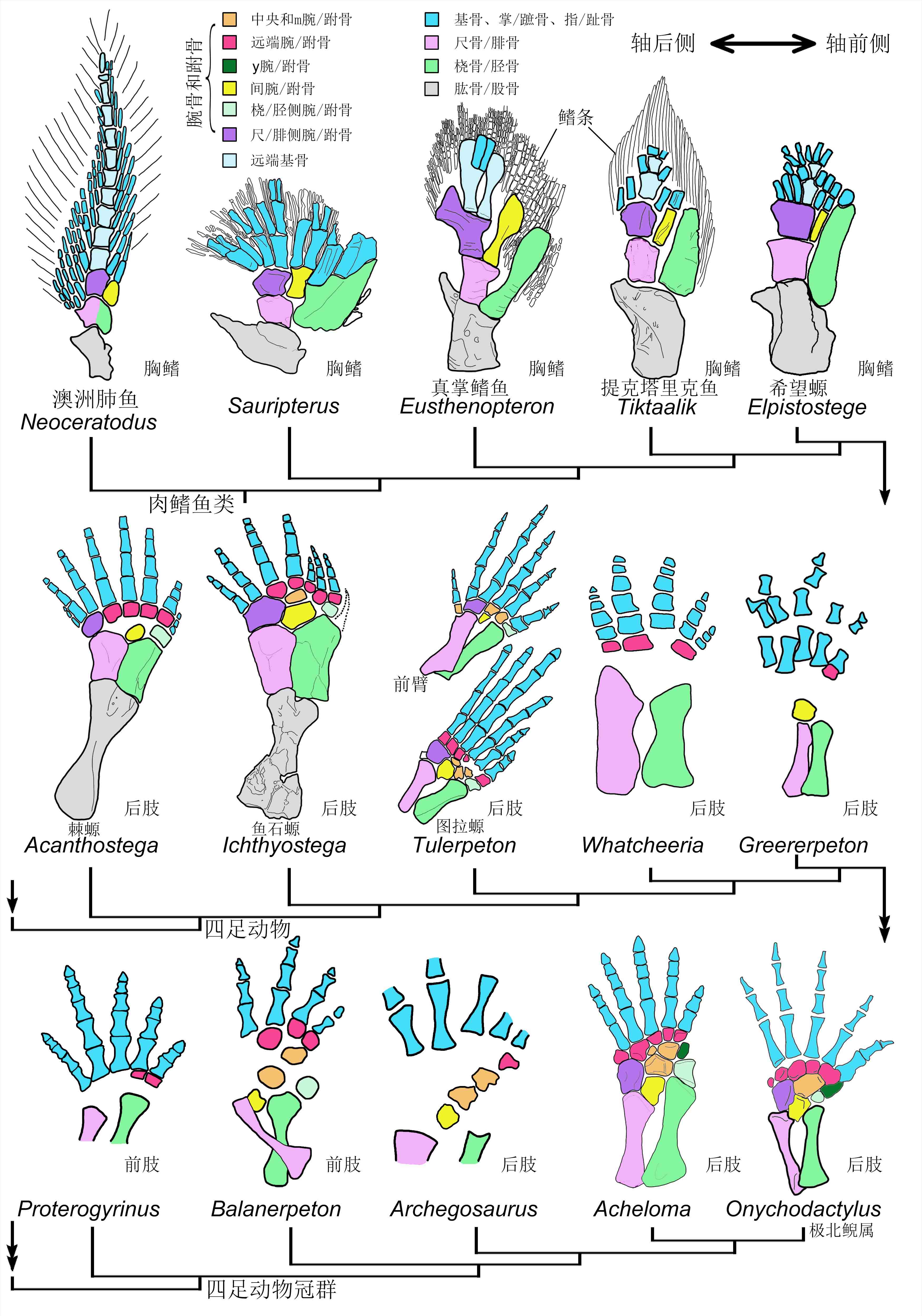 图5早期四足动物五指/趾型形成,远端腕骨和跗骨的起源和骨化极性对比