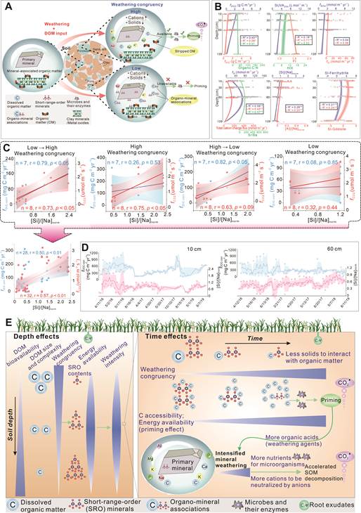 图1(A)矿物风化影响微生物碳激发效应示意图; (B)重要生物地球化学和矿物学参数随深度变化曲线;(C)矿物风化协调性对有机质矿化速率的控制;(D)矿物风化协调性与DOC通量在不同深度呈现不同耦合规律;(E)矿物风化与微生物碳激发过程之间的联系在时间和空间尺度上的表现