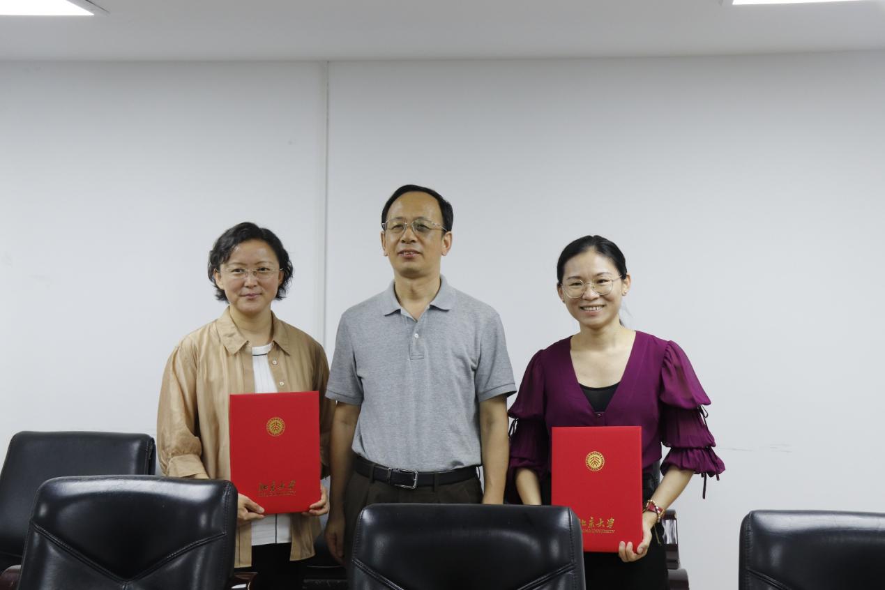 李培军向2019级本科毕业班班主任代表,2019级1班黄宝琦和2019级2班陈咪咪颁发感谢状,并与两位班主任合影留念。