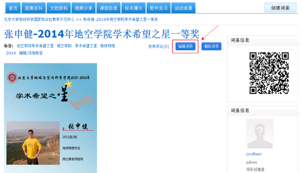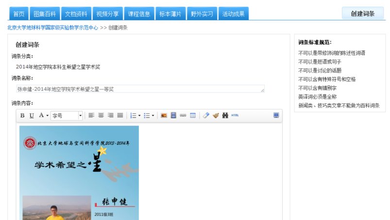 上传个人宣传海报和PPT操作方式相同。点击“创建词条”按钮,进行“创建词条”。