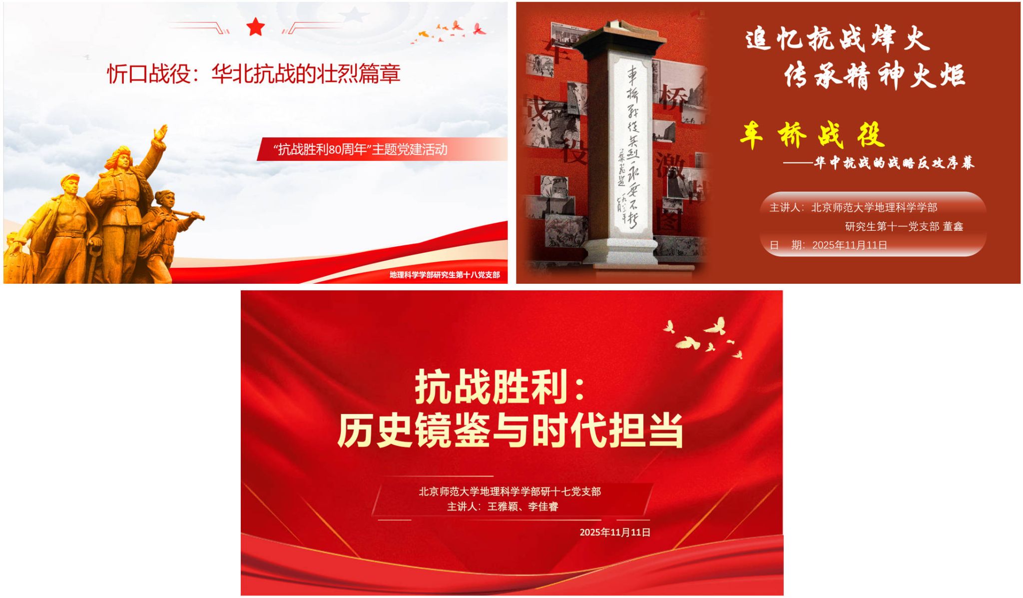 北师大地理学部研究生第十八党支部宋文佳同志从忻口战役入手,回顾了1937年10月至11月中国军队在华北地区与日军展开的殊死搏斗,指出这场虽败犹荣的战役以血肉之躯筑起民族防线,彰显了坚决抵御外敌的民族团结精神。北师大地理学部研究生第十一党支部书记董鑫同志以车桥战役为例,生动讲述了新四军以夜袭突击、设伏打援的灵活战术打通苏中、苏北、淮南、淮北四大战略区的联系,展现了中国军民英勇顽强、不畏牺牲的铁军风貌。北师大地理学部研究生第十七党支部书记王雅颖同志从“十四年抗战”全景出发,深入剖析了中国战场在世界反法西斯战争中的重要地位,阐释了抗战精神中所蕴含的爱国情怀、民族气节、英雄气概与必胜信念。
