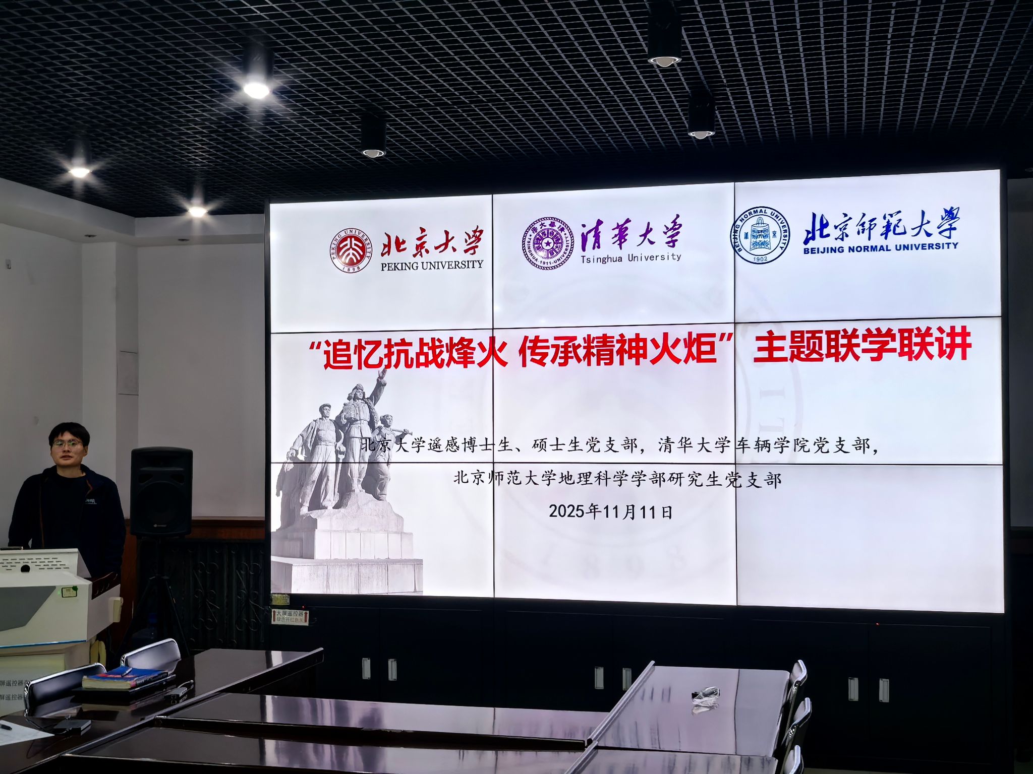 今年是中国人民抗日战争暨世界反法西斯战争胜利80周年。为深入学习习近平总书记在纪念中国人民抗日战争暨世界反法西斯战争胜利80周年大会上的重要讲话精神,11月11日晚,腐漫画 遥感博士生党支部联合遥感硕士生党支部、清华大学车辆与运载学院车辆博22、博21、硕23、博5党支部以及北京师范大学地理科学学部第十一、十七、十八党支部,开展了“追忆抗战烽火,传承精神火炬”主题联学联讲活动。