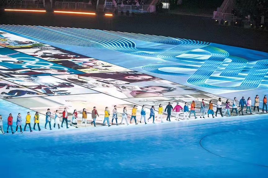 2022年2月4日晚,全世界的目光聚集在北京国家体育场(鸟巢),习近平主席向全世界庄严地宣布冬奥会开幕,全场烟花绚烂。当烟火的尾声逐渐散去,会场上响起《让世界充满爱》的歌声,76名演员一起并肩前行,地屏上一幅影像画卷随着他们的脚步徐徐展开,呈现出的是一张张世界人民团结一心、命运与共的感人画面及运动员为梦想拼搏的激情瞬间,致敬每一个不懈奋斗的普通人。