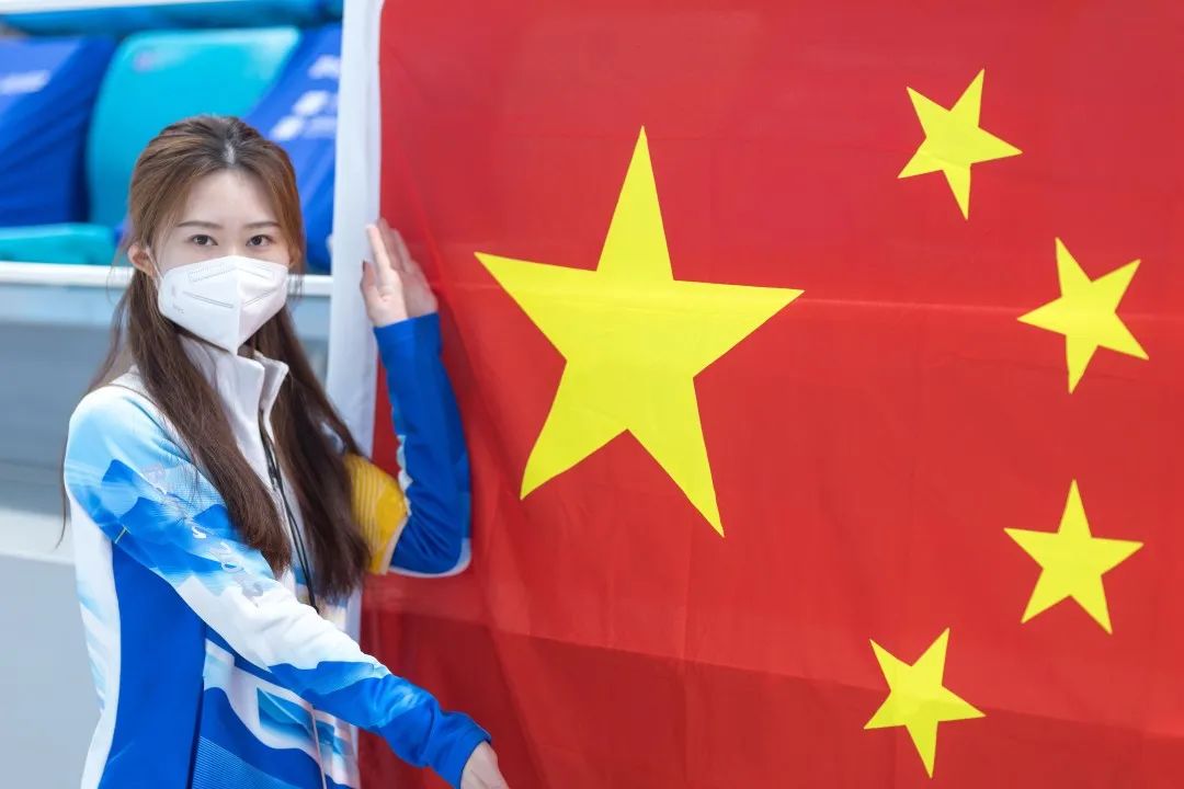 王聆月在看台上与国旗合影
