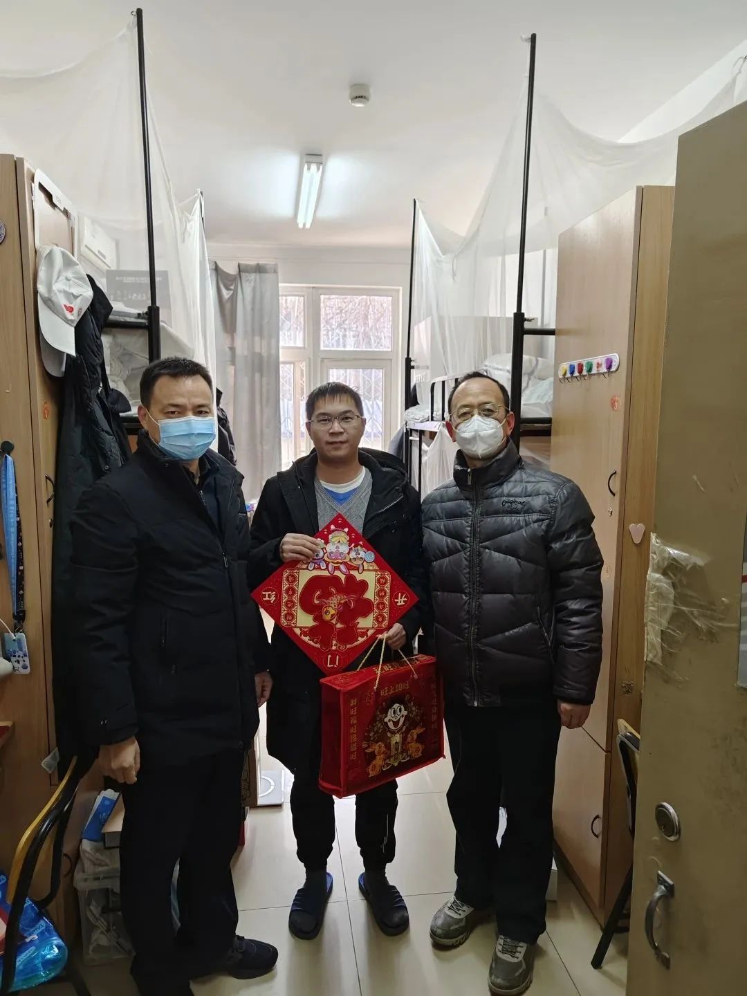 因科研学业、就业实习等原因目前仍在校近140人,留校过年预计39人。在本次慰问活动中,学院领导和老师们逐一探访留校过年的同学们,为同学们送上新春的美好祝福,发放学院准备的满满的新年礼物,包含春节零食大礼包和“福”字,希望同学们新一年福气满满。
