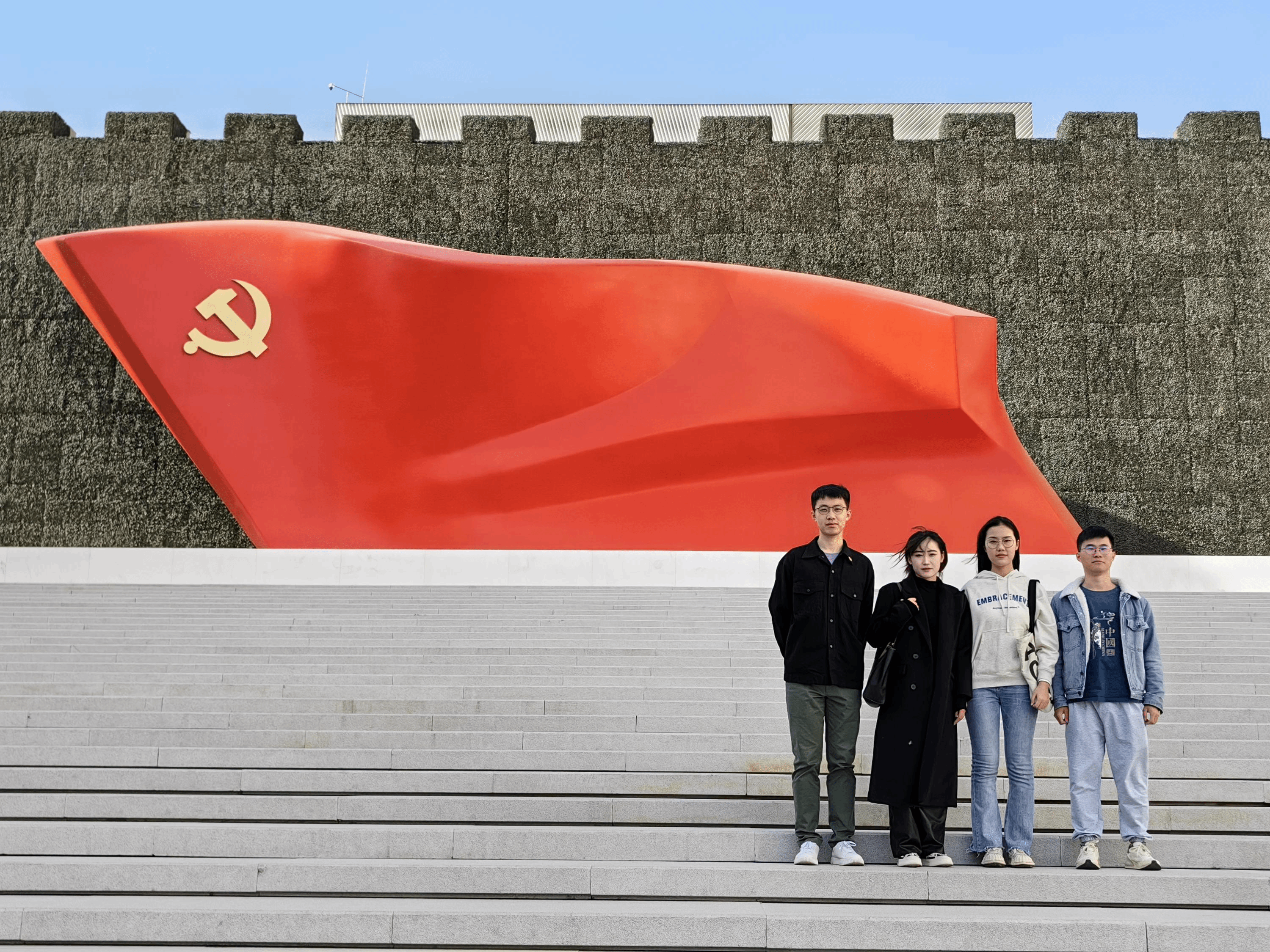 第一党小组组织前往中国共产党历史展览馆进行参观学习。这座坐落于北京市朝阳区北辰东路与大屯北路交会处的展览馆庄严而恢弘,展览馆门前巨大的党旗在蓝天映衬下格外鲜艳。