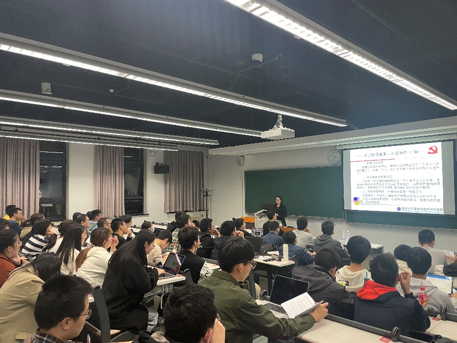 王一涵老师开头便向同学们提出了为何入党,党是什么样的组织的问题,引导大家主动思考个人入党动机以及入党条件,并结合党章内容给出明确答案,强调了5项入党条件与党员应尽的8条义务。接下来王一涵老师结合习近平总书记考察北大时讲话的精神和要求,对同学们给予了“勤学、修德、明辨、笃实、爱国、励志、求真、力行”的十六字期望。