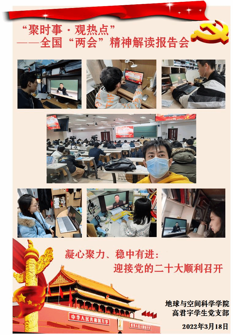 高君宇学生党支部积极组织成员参会学习。同学们热情高涨,以线上或线下的方式参与到报告会中,主动与其他成员分享心得体会,在贾庆国教授的解读下对两会精神进行更加深入的学习。