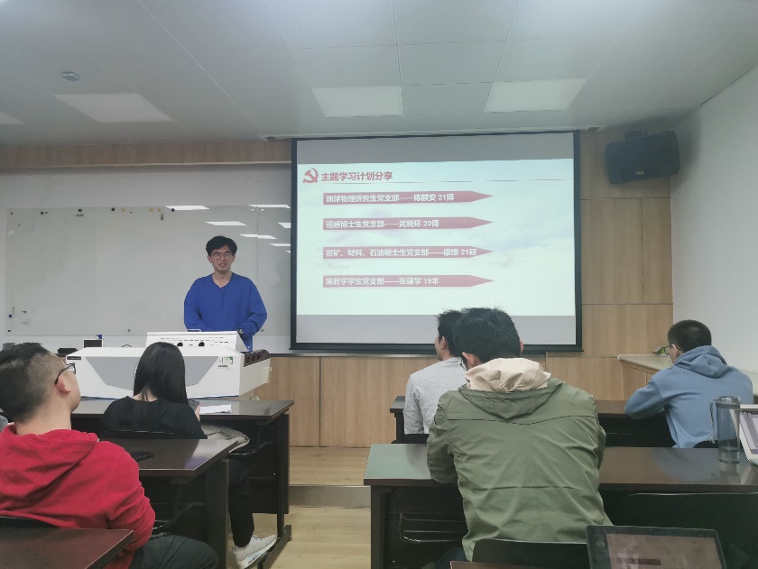 最后,四名来自不同党支部的预备党员代表分享了本支部的主题学习计划。来自地球物理研究生党支部的陈麒安提到,支部将带领成员在开展理论学习的基础上,开展对于当下实事、科学研究、专业发展的讨论,并使用党的相关理论来分析问题,实现共同进步。遥感博士生党支部的武晓环分享了支部将以“请党放心,强国有我”为主题开展学习活动,从冬奥相关知识学习、党的理论学习与实践教育三个方面组织学习,并结合毕业季、学院大楼迁出等重要事项开展实践活动。岩矿、材料、石油硕士生党支部的康缘提到,支部将结合“请党放心,强国有我”的党团日活动,依托学校有效的红色教育资源,通过专家导学、集体研学和自学的形式开展主题学习,在强化支部成员的政治理论素养的同时,支部将尽可能丰富主题学习的形式,让支部成员有所收获,学有所得。高君宇学生党支部的张建学提到,支部将以个人学习、小组讨论与组间交流为形式开展主题学习与讨论活动,调动支部成员的学习积极性,在思想交锋和理性辨析中进行理论学习教育。