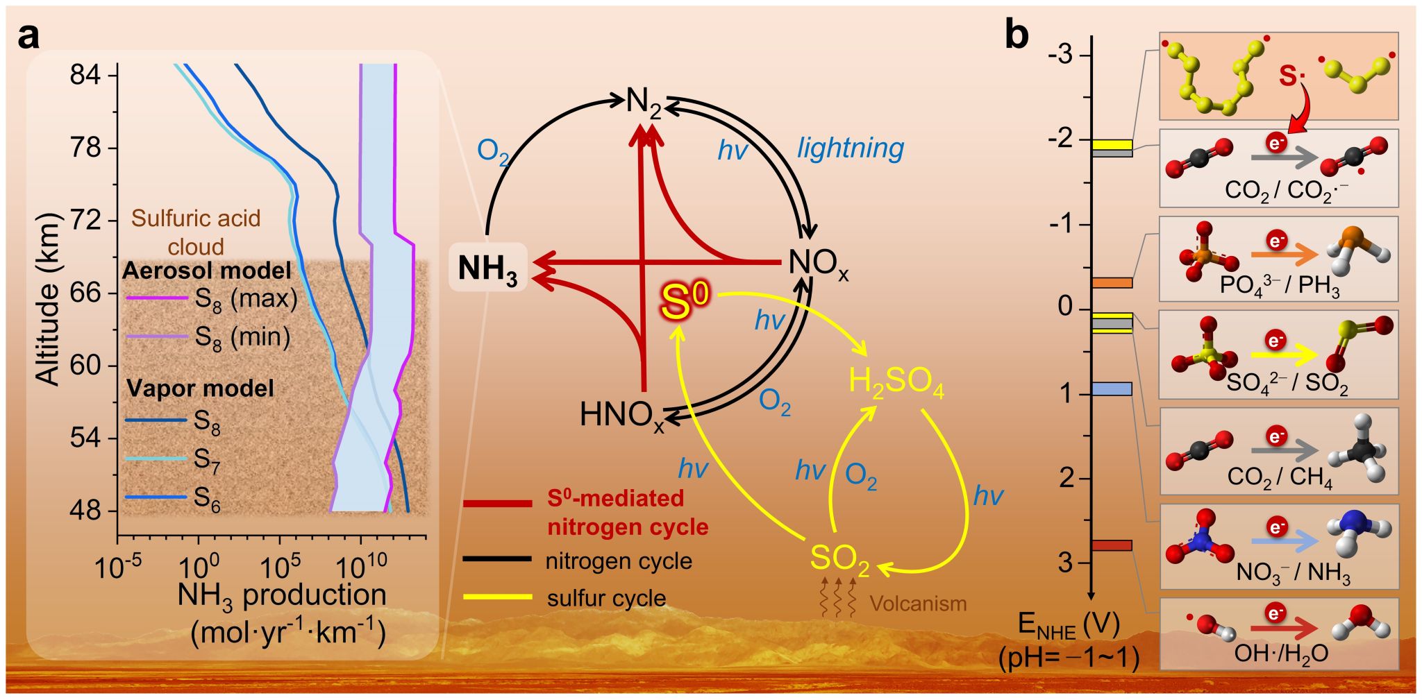图3. 金星大气中硫—氮耦合光化学模型。a: 光活性硫同素异形体催化氨生成的速率随大气高度分布;b: 链状硫与金星大气中“疑似生命信号”物种的电势对比。