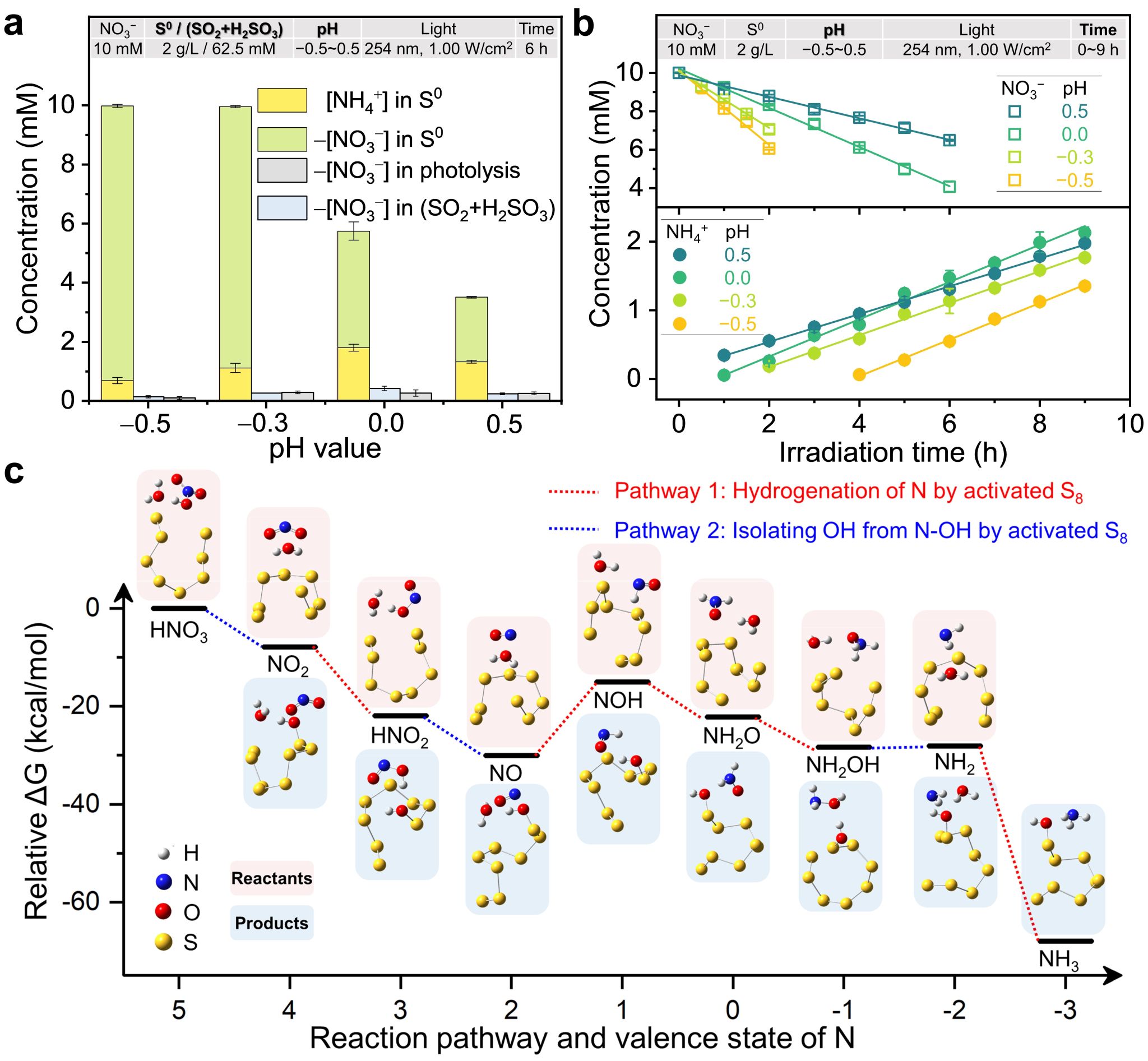 图2. 模拟金星云层光化学实验与量子化学计算结果。a: 不同条件下对比;b: 硝酸根与氨浓度随时间变化曲线;c: 氨合成反应的电子转移路径。