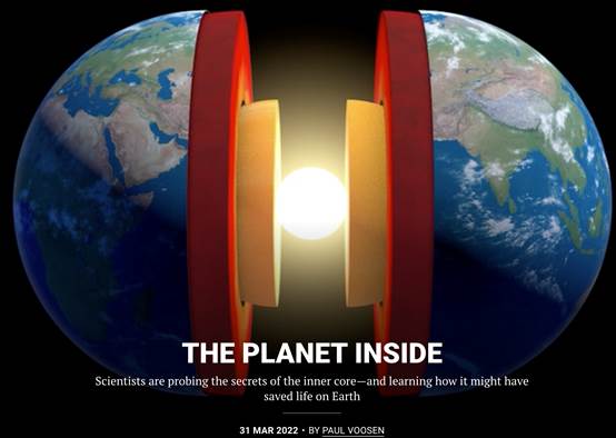 2022年3月31日国际著名期刊《Science》的地球与行星科学专栏作家Paul Voosen发表特写新闻报道“Scientists are probing the secrets of the inner core—and learning how it might have saved life on Earth”(1)。地球的内核由于其独特的结构和相对独立的自转速率被称为地内的星球“The Planet Inside”。最新研究表明内核在距今约5亿年前从液态的外核中凝析而成,由此彻底改变了地球的磁场,为生物提供了更好的保护层,促进了寒武纪的生命大爆发。因此,内核的研究对认识行星和生命的演化历史至关重要。