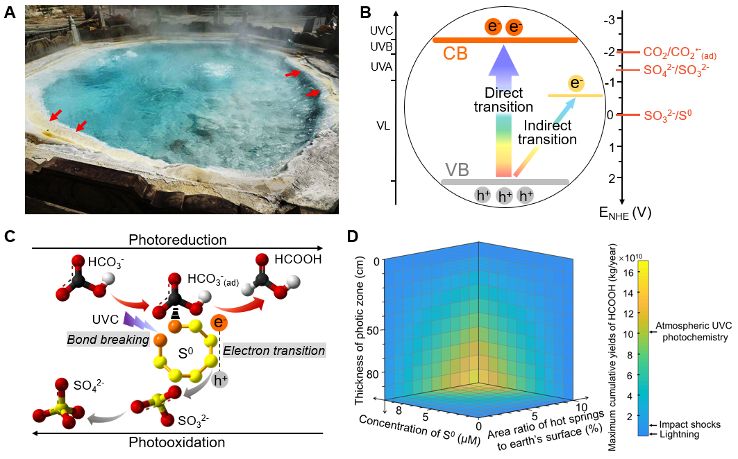 鲁安怀/李艳课题组在我国云南腾冲陆地热泉中采集自然硫矿物(α-S8,俗称硫磺)(图1A),模拟地球早期陆地热泉的介质条件,实验研究发现自然硫矿物受到波长小于280 nm的紫外光(UVC)激发时,在从酸性至碱性的宽松介质条件下,均可持续还原大气二氧化碳(CO2)形成典型有机小分子物质之一的甲酸(HCOOH)。利用光谱学、光电化学研究方法和密度泛函理论计算,证实自然硫是一种兼具间接带隙(2.6 eV)和直接带隙(4.4 eV)的半导体矿物,UVC激发下的直接带隙跃迁模式将电子从π*反键分子轨道(价带)直接激发跃迁到σ*反键分子轨道(导带)上。导带较高的能量赋予光电子强还原性(-2.34 V vs. NHE,pH 7),可耦合质子直接还原CO2(-1.90 V vs. NHE)形成HCOOH(图1B)。电子顺磁共振和红外光谱等原位谱学研究表明,自然硫α-S8的基本结构单元—8个硫原子组成的环状分子结构,在光催化反应过程中产生表面活性硫自由基,并发生开环断裂,完成从非极性到极性分子的转化,从而促成CO2在矿物表面的化学吸附与电子传递(图1C)。通过模拟早期地球陆地光照强度和CO2浓度、自然硫矿物含量、早期地球陆地热泉占比、紫外线穿透深度等参数,评估了这一反应模型在早期有机物形成与积累中的贡献。结果显示,若自然硫以10μM的浓度悬浮于热泉体系中,占地球表面1%的陆地热泉系统在10 cm厚的表层透光层内每年积累的有机物质(约109 kg量级),即可达到与传统的闪电成因有机物质(109 kg)、陨石撞击成因有机物质(1010 kg)和星际尘埃颗粒成因有机物质(107 kg)等产量基本相当的水平(图1D)。显然,在广泛发育陆地热泉的早期地球表面,自然硫光催化还原二氧化碳合成生命起源物质的数量是很可观的。