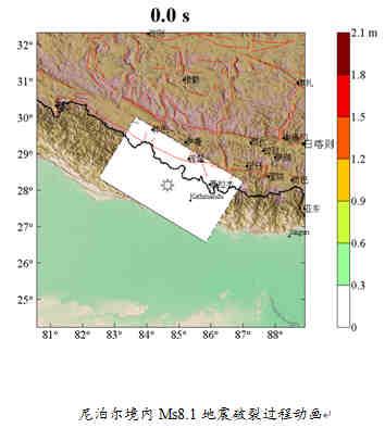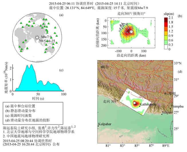 其结果表明,尼泊尔地震的矩震级为MW7.86,约为7.9。破裂最主要的特征是朝东南方向传播,由于尼泊尔首都加德满都同样位于震中东南方向,可能将遭受较为严重的破坏,是此次地震的首要重灾区。同时,由于破裂没有大规模出露地表,且绝对滑动量不大,因此地震规模尽管与汶川地震(MW7.9)大体相当,但造成的震感比后者应该相对弱一些。
