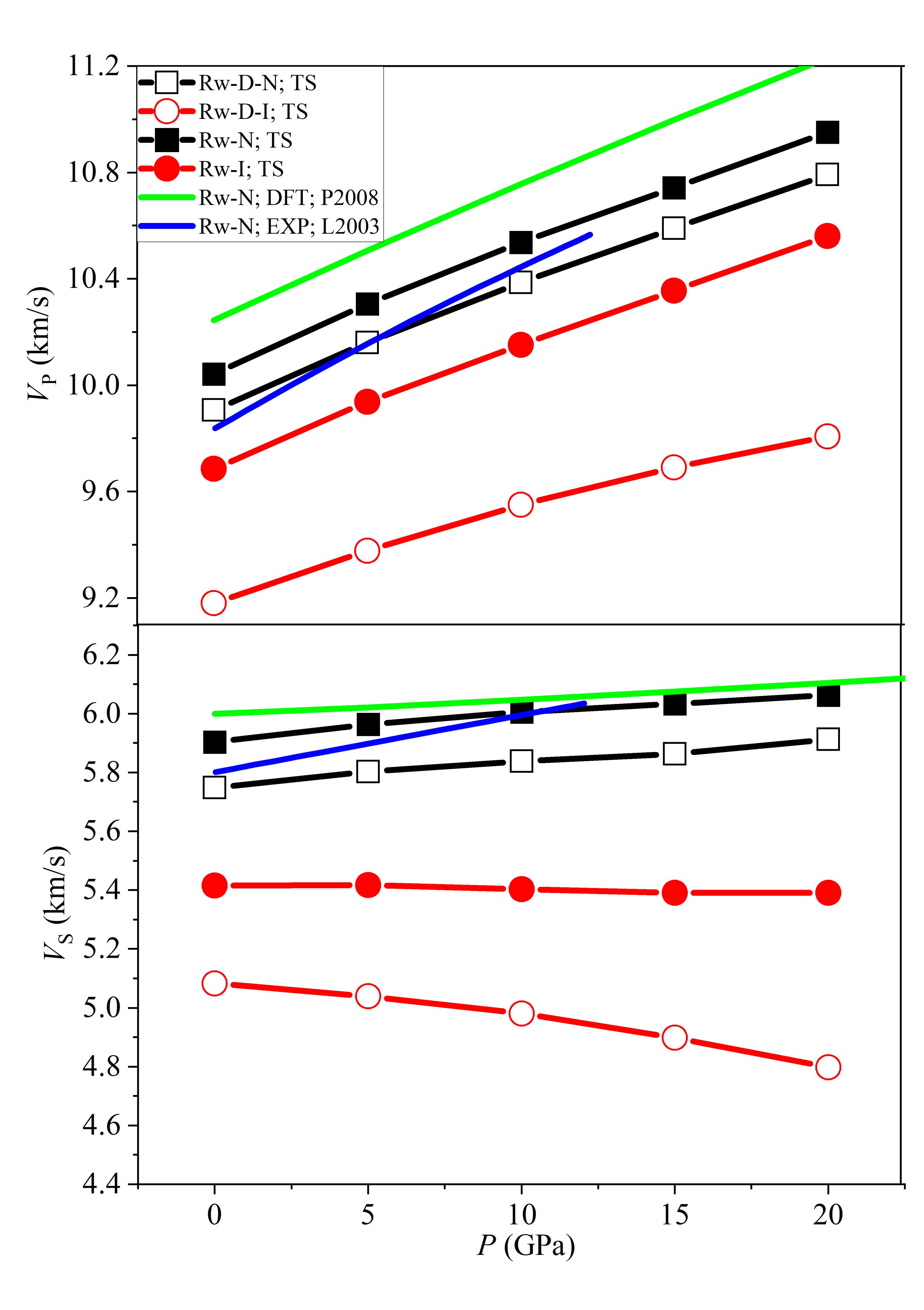 为探讨正-反林伍德石相变对地幔波速结构的影响,赵旭炜对含缺陷及不含缺陷的正、反林伍德石的弹性性质进行了计算,发现:正、反林伍德石的波速差异主要受正、反林伍德石结构差异的控制,与缺陷种类及其浓度关系不明显(图5);在20 GPa下,正、反林伍德石的P波和S波差异分别约为6%和11%,这种差异的存在足以导致可观测的地震波不连续面;当存在缺陷时,地幔橄榄石的高压相变序列变为橄榄石-瓦兹利石-反林伍德石-正林伍德石,相变深度分别对应410 km、520 km和560 km地震波不连续面(图6)。