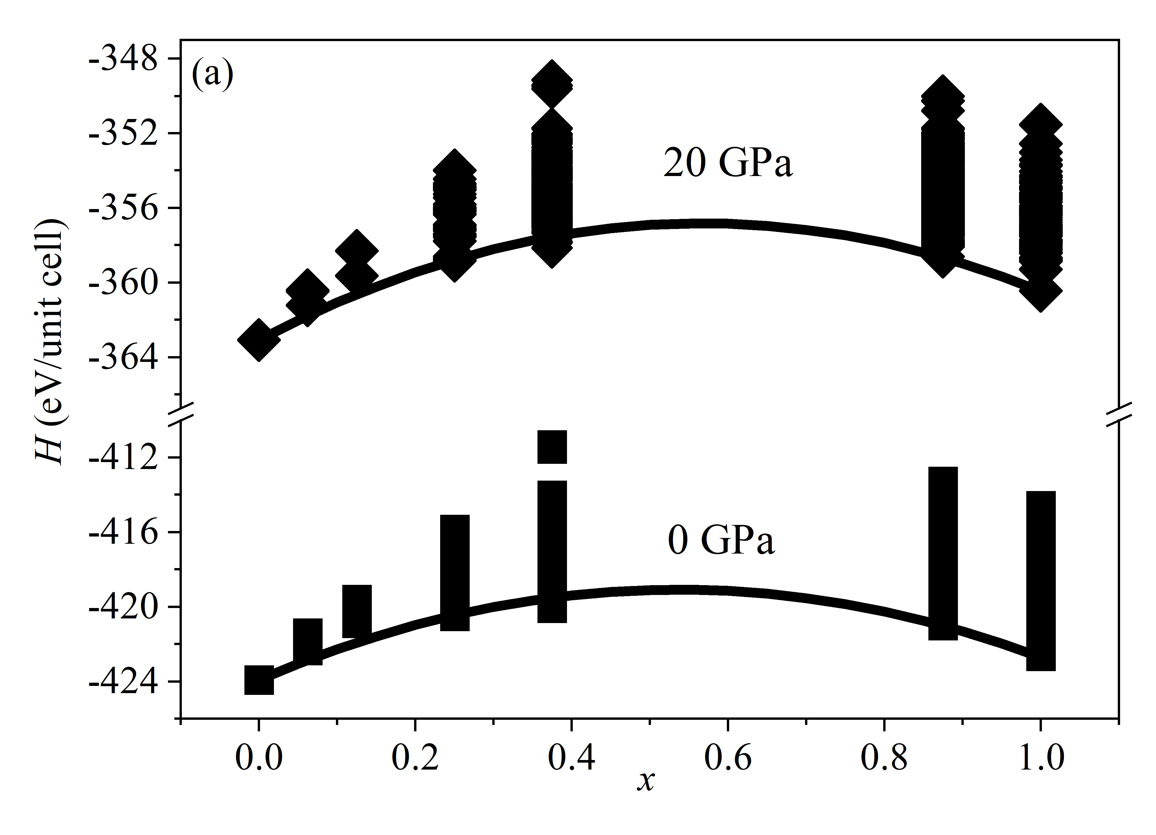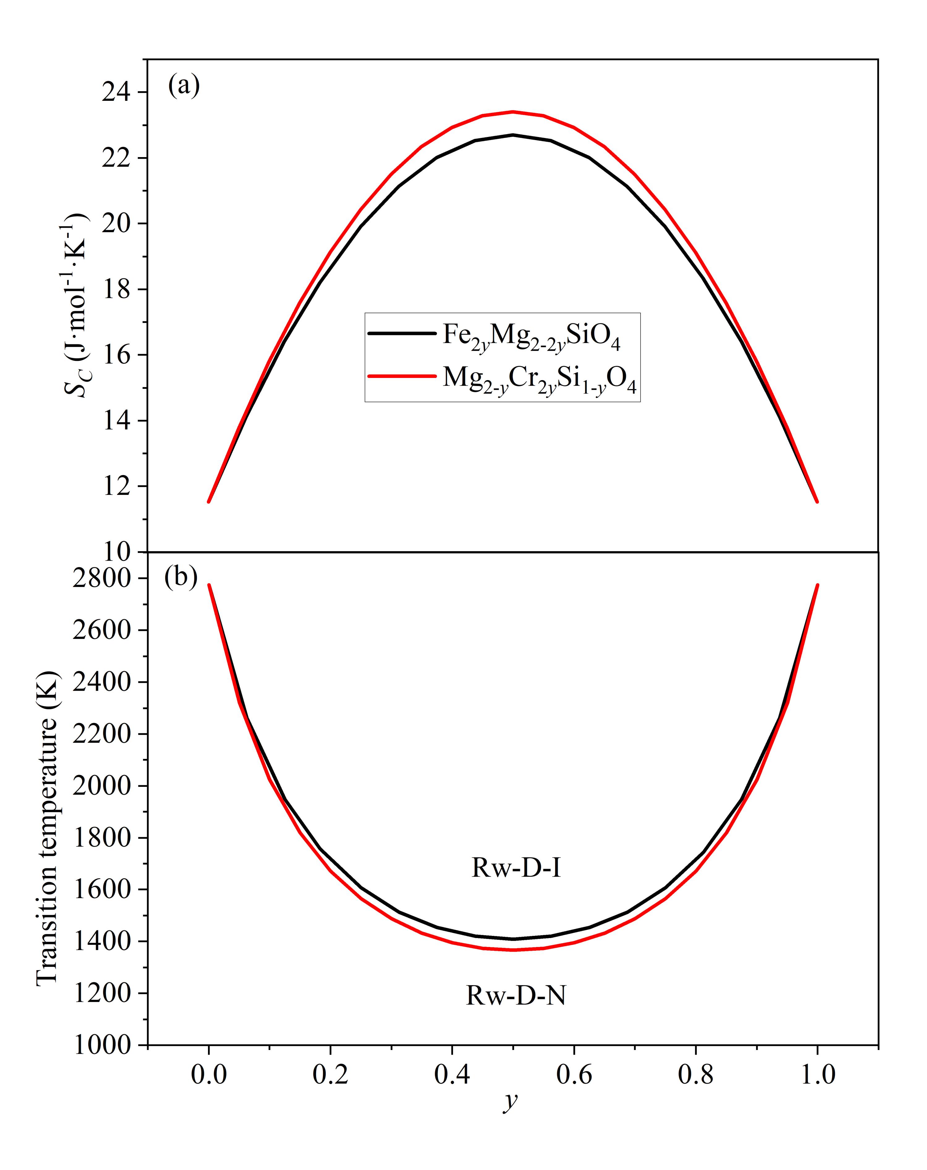 理论上,任意类型的缺陷都可以增大构型熵,降低正-反林伍德石的转变温度。在假设焓差不变的条件下,缺陷的引入可以导致正-反林伍德石的转变温度低至约1400 K(y = 0.5;图4)。因此,含缺陷反林伍德石在地幔过渡带中有可能普遍存在。
