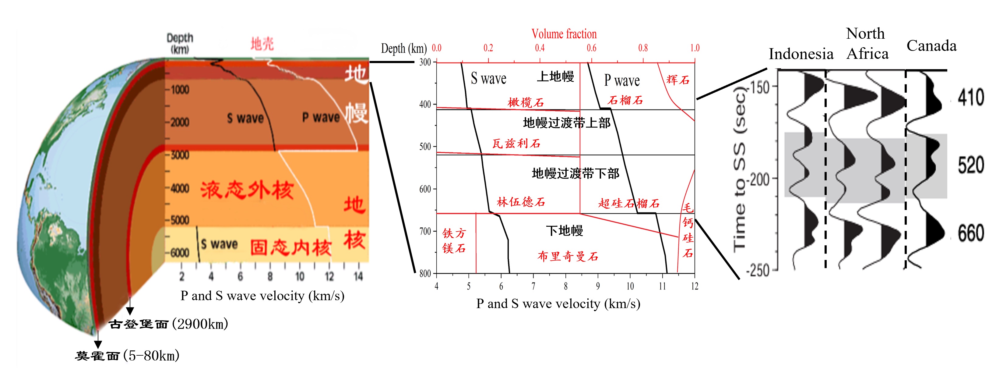 图1 (左图)地球圈层结构与地震波波速变化;(中图)地幔过渡带附近矿物成分及波速变化;(右图)地球部分区域的地幔过渡带附近不连续面深度