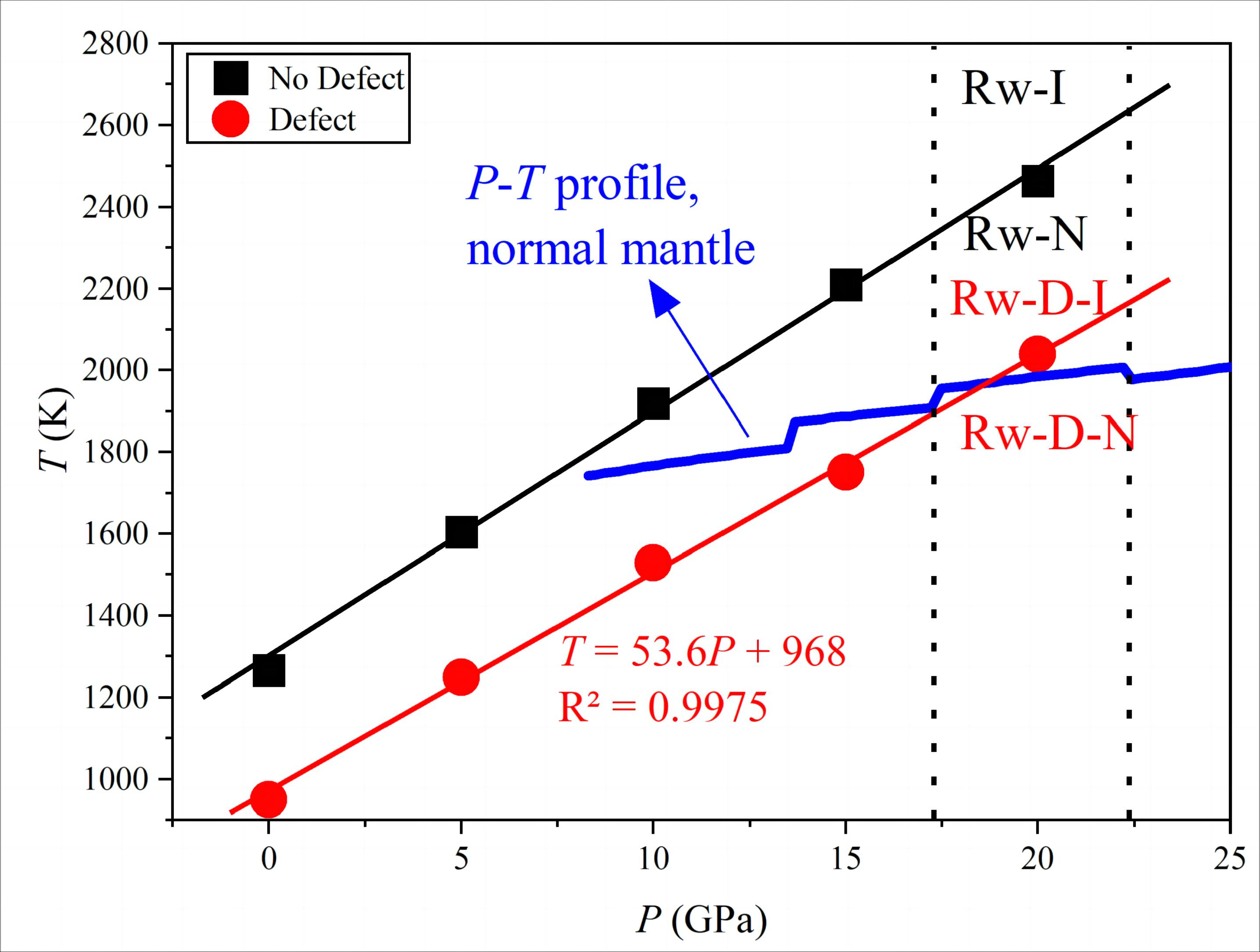 针对不含缺陷林伍德石的计算结果表明,林伍德石的能量随着离子位置交换的发生先增大后减小,正林伍德石和反林伍德石(一半Mg (Fe)离子占据四面体位置、另一半Mg (Fe) 和Si离子占据八面体位置)的能量较低,而其它无序状态的林伍德石的能量较高。另外,林伍德石中离子位置交换是一个熵增加过程,熵的变化也会对正-反林伍德石的相变产生影响。综合考虑这些因素,赵旭炜发现,不含缺陷反林伍德石的稳定温度非常高:在地幔过渡带压力条件下,超过~2400 K。由于地幔过渡带温度约为2000 K,不含缺陷反林伍德石因此很难在地幔过渡带稳定存在(图3)。