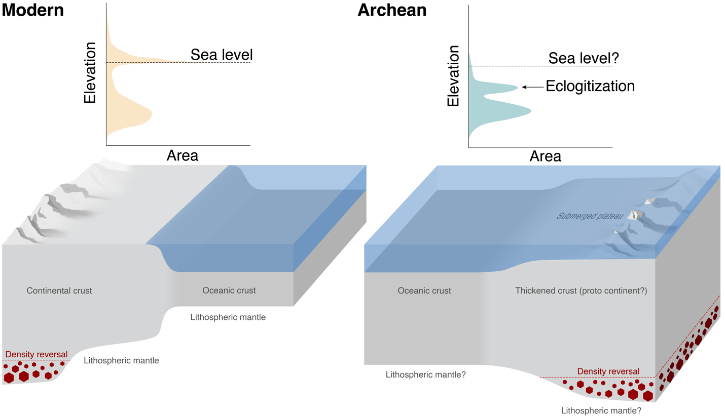 这是一个基于热力学与地壳均衡原理(本质是浮力原理)的简单规律,适用于地球的任何时期,甚至是其他岩石行星。唐铭团队将这个规律应用到地球早期,发现早期的地壳岩石由于化学成分的差异,发生相变需要的压力比今天更低,也就是会在更浅的深度变成榴辉岩而失去浮力。更糟糕的是,早期地球的洋壳比今天更厚,即使是形成同样的洋-陆高差,也需要陆壳比今天更厚。两个因素结合,早期地球的固体表面可能很难形成超过 3-5 km 的高程变化,这个值在今天是 8 km 以上。换句话说,早期地球的地表要比今天扁平,这便为大陆出露,形成海陆二分带来了巨大的困难。早期地球的表面,不可避免是一片汪洋。