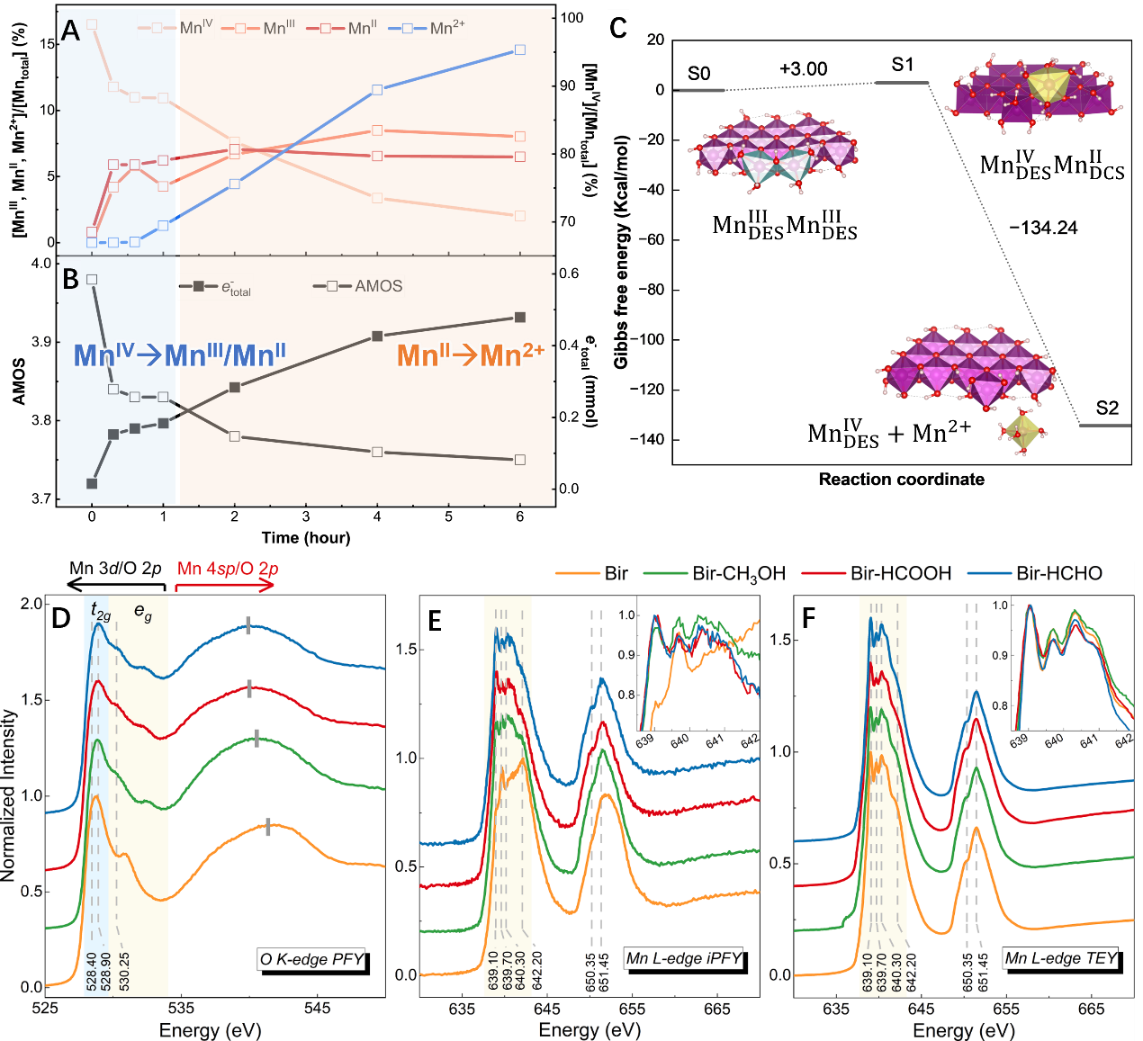 图1. (A)水钠锰矿固体MnIV、MnIII和MnII以及溶液Mn2+占总Mn比例随时间的变化曲线;(B)固体平均锰氧化度(AMOS)和总电子转移量随时间的变化曲线;(C) DFT计算揭示水钠锰矿内部电子转移和Mn2+释放的热力学机制;软X射线吸收光谱显示(D) OK-edge PFY,(E) MnL-edge iPFY(内部Mn),(F) MnL-edge TEY(表面Mn)。