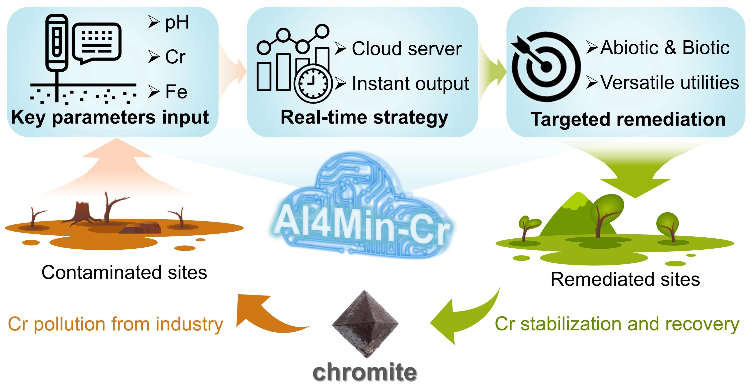 在当前AI时代背景下,团队积极倡导“数据驱动科学发现与开放共享”的理念,构建了包含近万组来自计算和实验数据的铬铁矿生成反应Gibbs自由能数据集,开发了在连续变量条件下铬铁矿沉淀的理论模型,并将其转化为AI4Min-Cr开源数据工具(//cr.ai4mineral.com)。该工具可根据用户输入的pH值以及不同化学形态的Fe、Cr浓度等关键参数,通过动态建模生成定制化的铬污染修复方案。AI4Min-Cr是国际上首个将环境矿物学与矿物信息学相结合并面向环保应用的智能工具,体现了铬元素“从铬铁矿中来,再回到铬铁矿中去”的自然循环理念(图2),为铬污染的靶向治理提供了高效率、低成本的矿物学新策略。