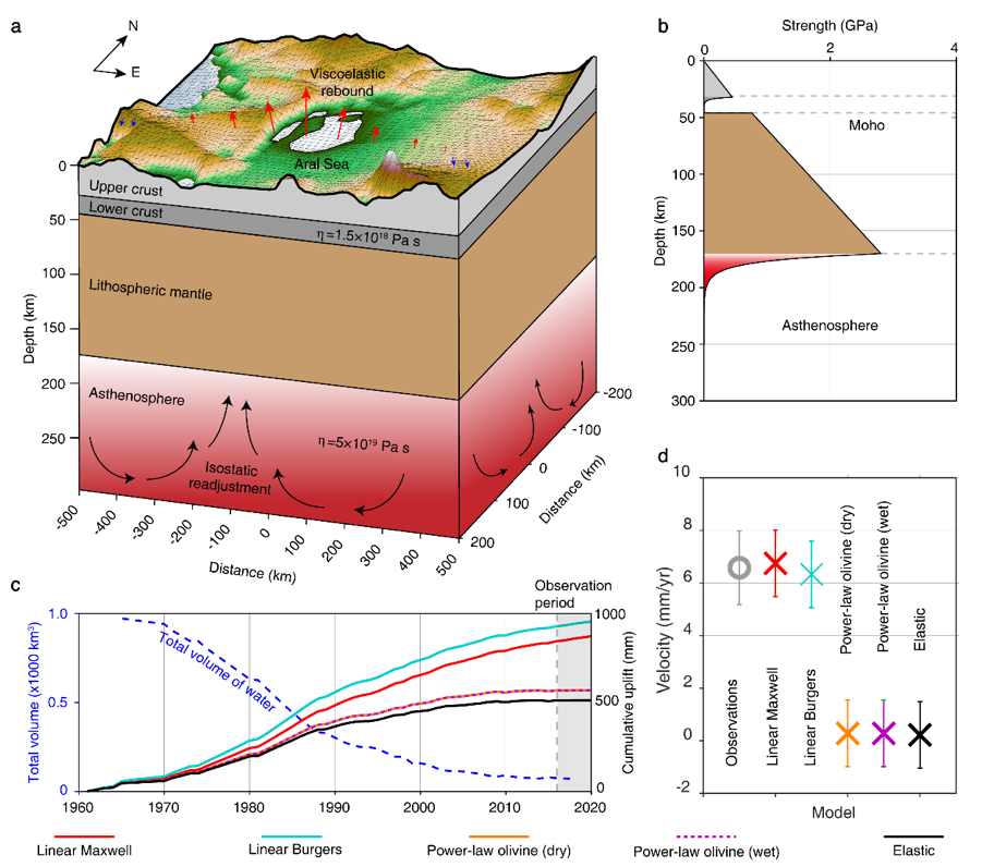 因为人类活动的影响,曾经的世界第四大湖咸海目前已经接近干涸,超过1000立方千米的湖水流失,其产生的负载变化足以激发软流圈的响应。王腾与合作者通过长期技术攻关,创新性的提出了“长短时间基线结合”的InSAR长波形变提取方法,绘制了咸海及其附近区域约58万平方公里范围的地表形变场。研究发现,2016年至2020年间,咸海地区出现了峰值7毫米/年的地表抬升,形变模式呈放射状衰减,波长可达500千米。数值模拟发现,这种抬升模式可以用岩石圈地幔下软流圈的黏弹性松驰来解释。当软流圈深度为130‒190千米、有效黏度为4‒7×1019帕秒时,模拟结果和观测得到的地表形变基本吻合。这一软流圈黏度值略大于俯冲带地幔,但比极地地盾下方软流圈黏滞系数小1‒2个数量级。
